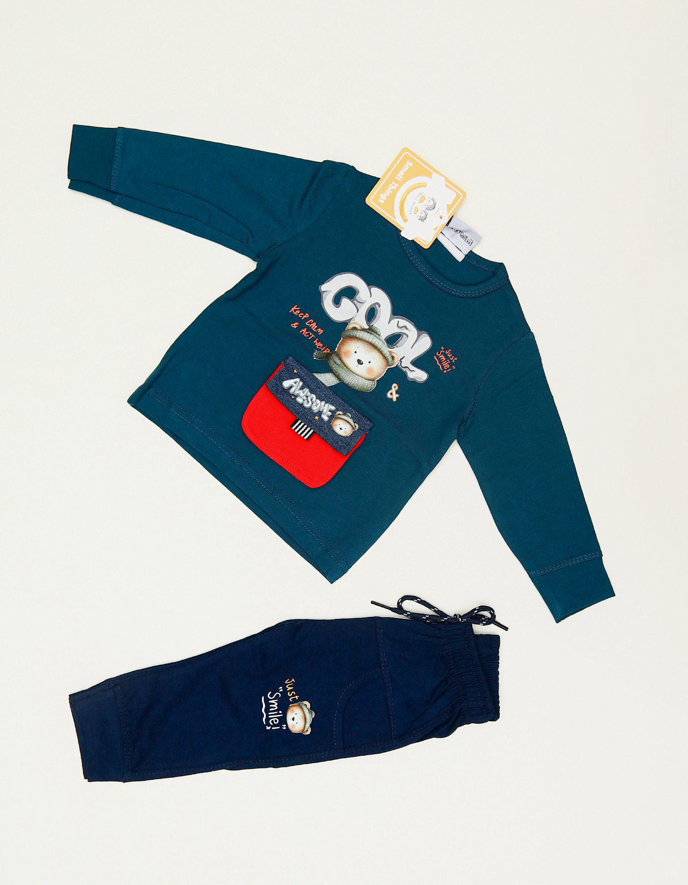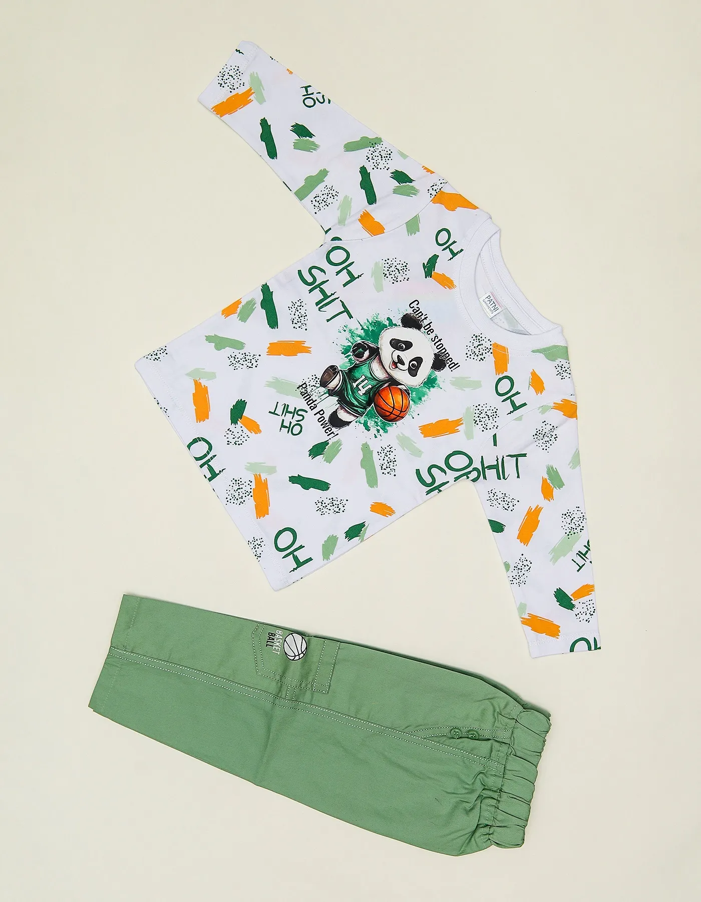 Soft two-piece set for kids featuring a black graphic top and light gray pants with cute bear accents. Comfortable and easy wear for everyday play.