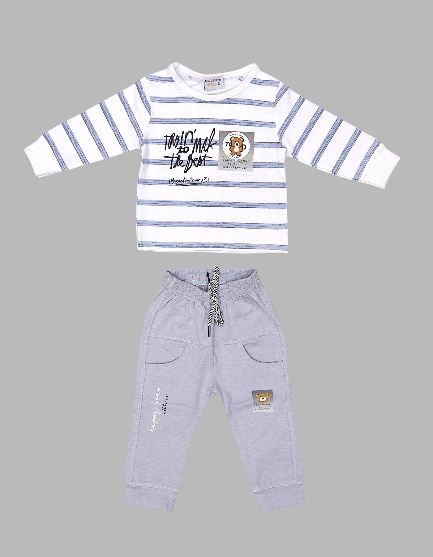 2-Piece Set: Striped top with teddy bear patch and jogger pants.