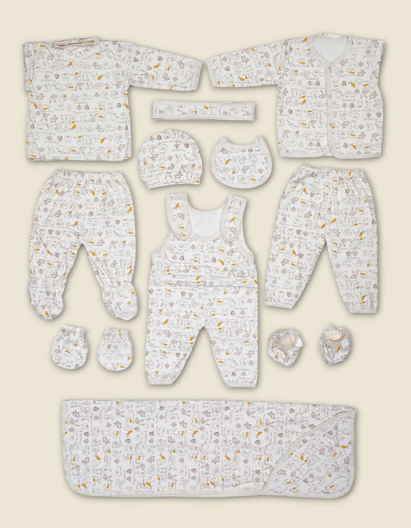 A soft and coordinated baby clothing set featuring whimsical animal prints in light brown and yellow tones. Includes all essential garments and accessories for newborn comfort and style.