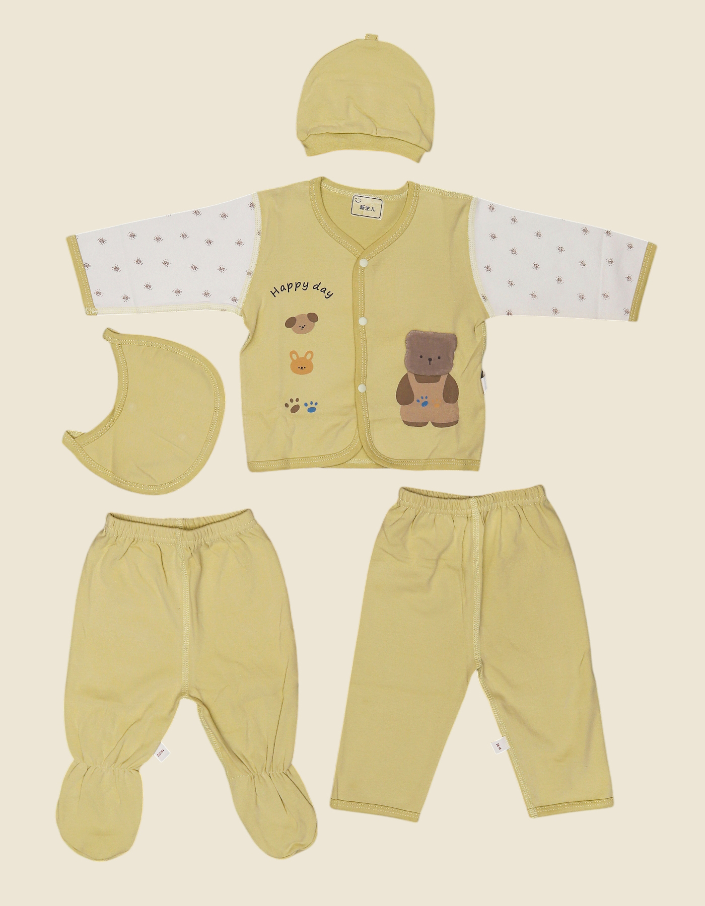 Keep your newborn cozy and stylish with the Baby 5-Piece Soft Cotton Newborn Clothing Set in light green. Crafted from gentle, breathable cotton, this set is designed for maximum comfort on delicate skin. Featuring a cheerful bear-themed design with the phrase Happy Day, its perfect for adding a touch of joy to your little ones daily outfits. A practical and adorable choice for everyday wear or as a thoughtful newborn gift.