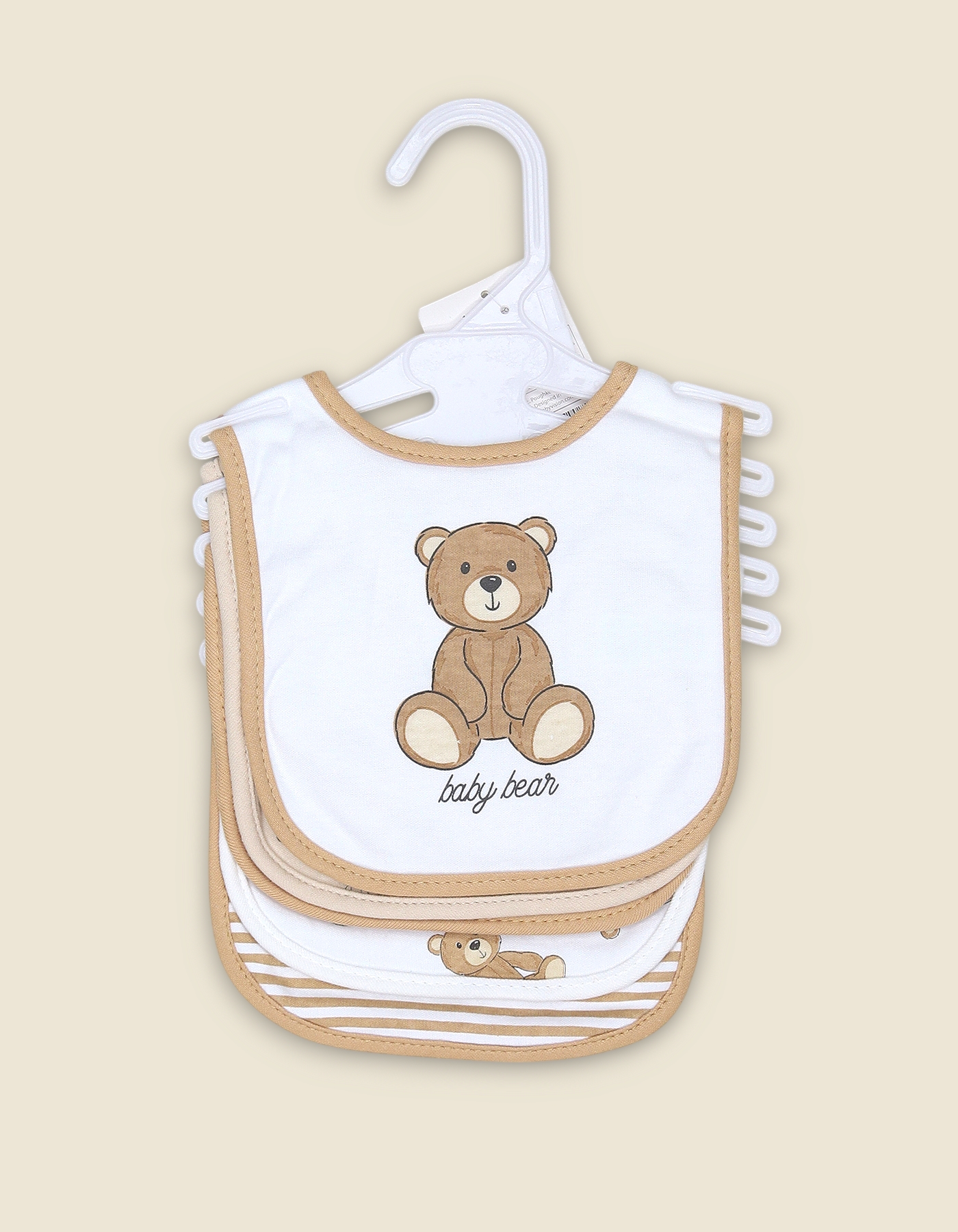 Soft and absorbent baby bibs with teddy bear design and beige trim. Perfect for newborns, feeding and gifting.