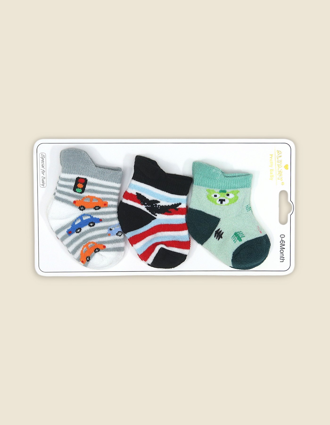 A set of three cute baby boys socks in playful designs. Soft cotton blend, gentle on newborn skin, and sized for 0 to 6 months. Perfect for daily wear or as a small gift.