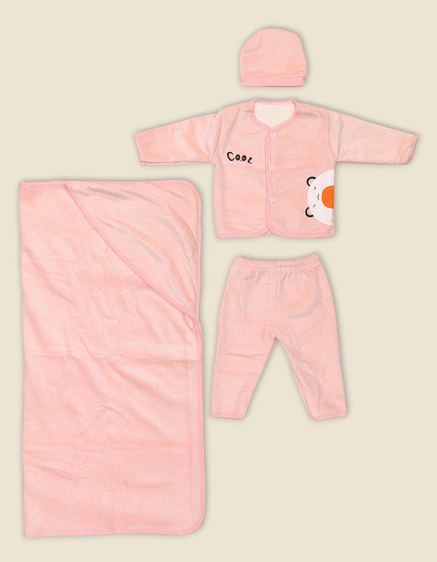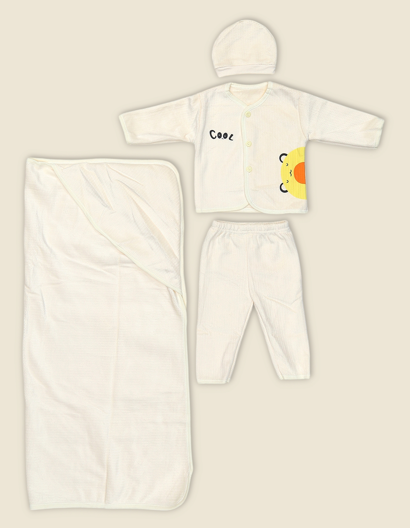 Adorable four-piece baby clothing set in cream with a cheerful bear print and “Cool” text. Includes shirt, pants, hat, and blanket—perfect for daily wear or gifting.