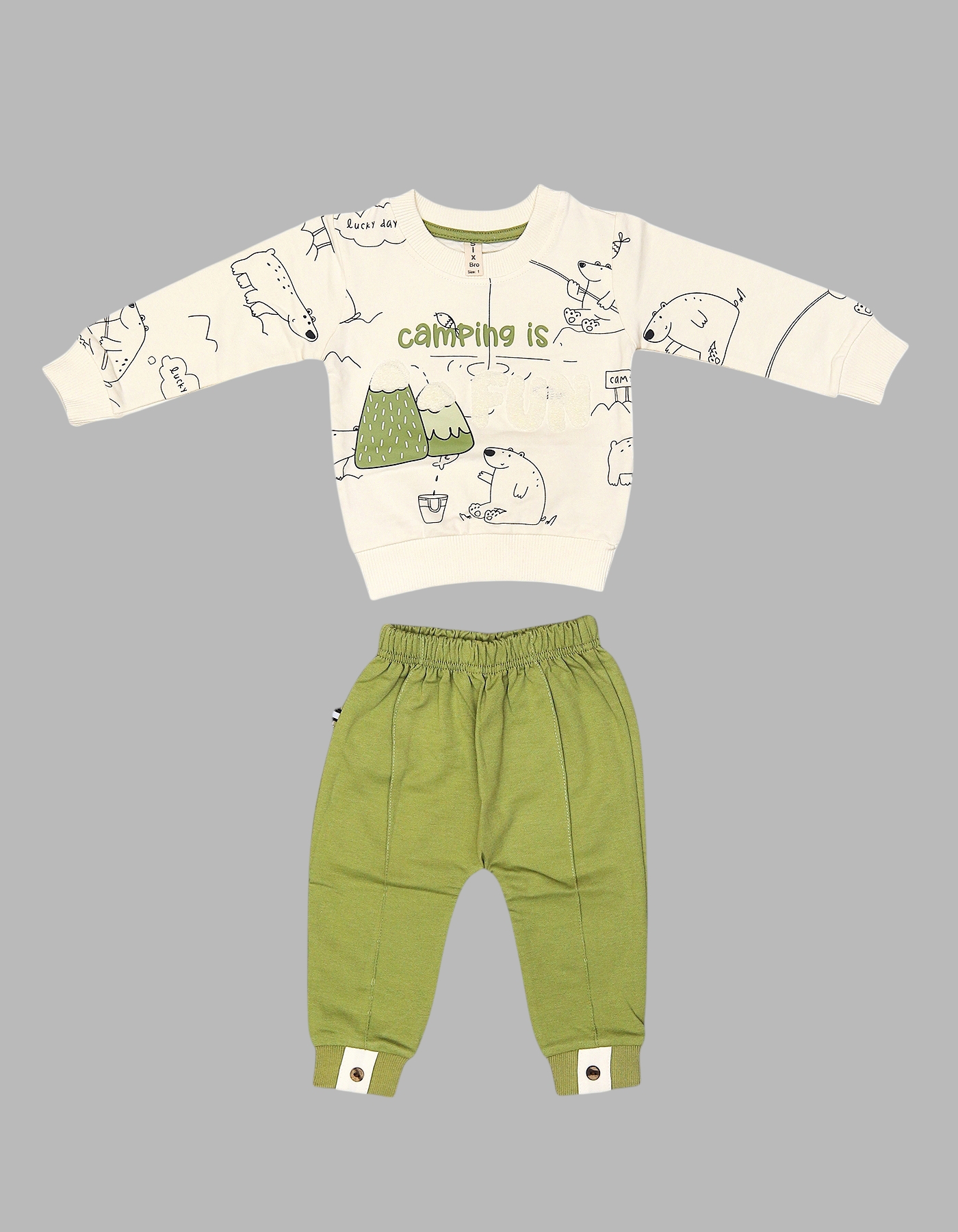The Baby Cotton Camping Is Fun 2 Piece Outfit Set is the perfect blend of comfort and playful style for your little one. Made with soft, breathable cotton, this set includes a long sleeve printed sweatshirt and comfy elastic waist pants. The fun camping-themed print with cute bears and nature illustrations makes it a cheerful choice for everyday wear. Available in Green and Pink color.
