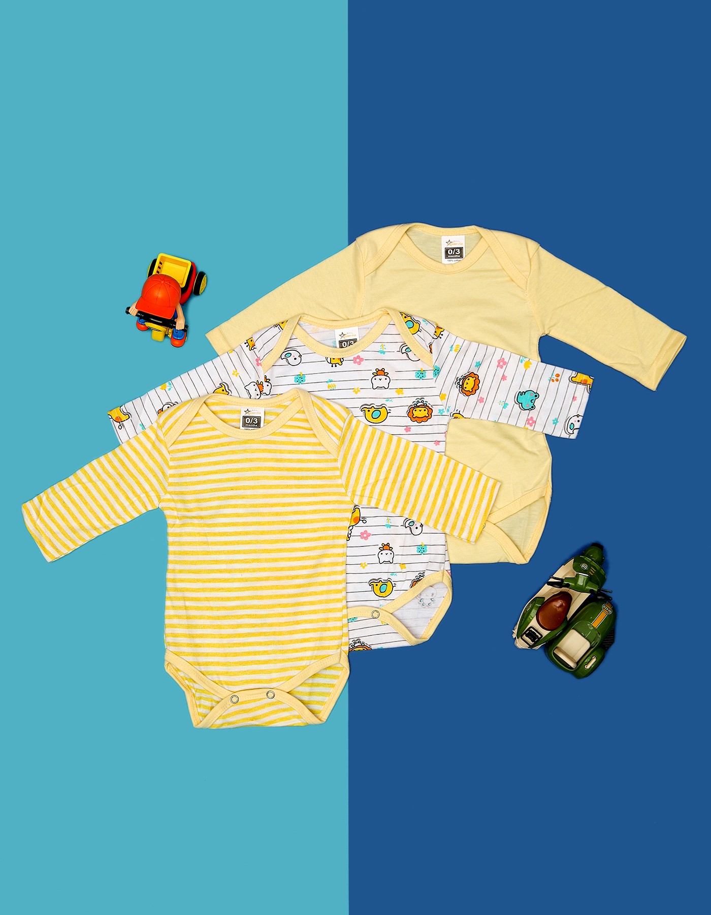 The Yellow Frog Baby Full Sleeves Bodysuit Set features three adorable pieces with cheerful frog prints and calming tones for variety and fun. Made from breathable cotton, it's designed to keep your baby warm, cozy, and happy during daily activities.