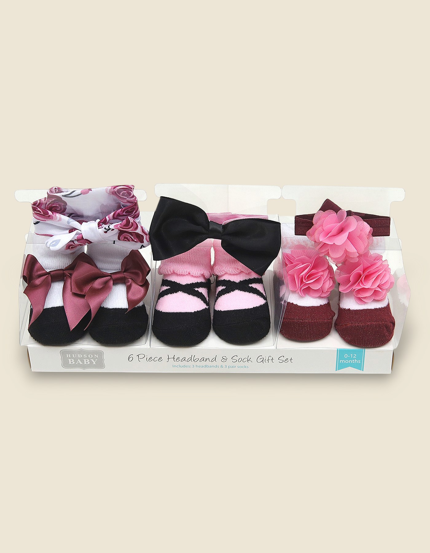 A six piece headband and sock gift set for baby girls. Includes three headbands and three pairs of matching socks in floral and bow designs. Soft and comfortable for newborns to 12 months. Perfect for gifting or everyday wear.