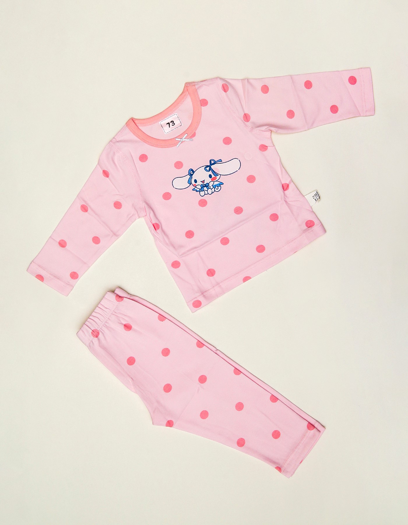 A soft and stylish two-piece outfit for baby girls, designed with a cute polka dot print and a playful bunny graphic on the front.