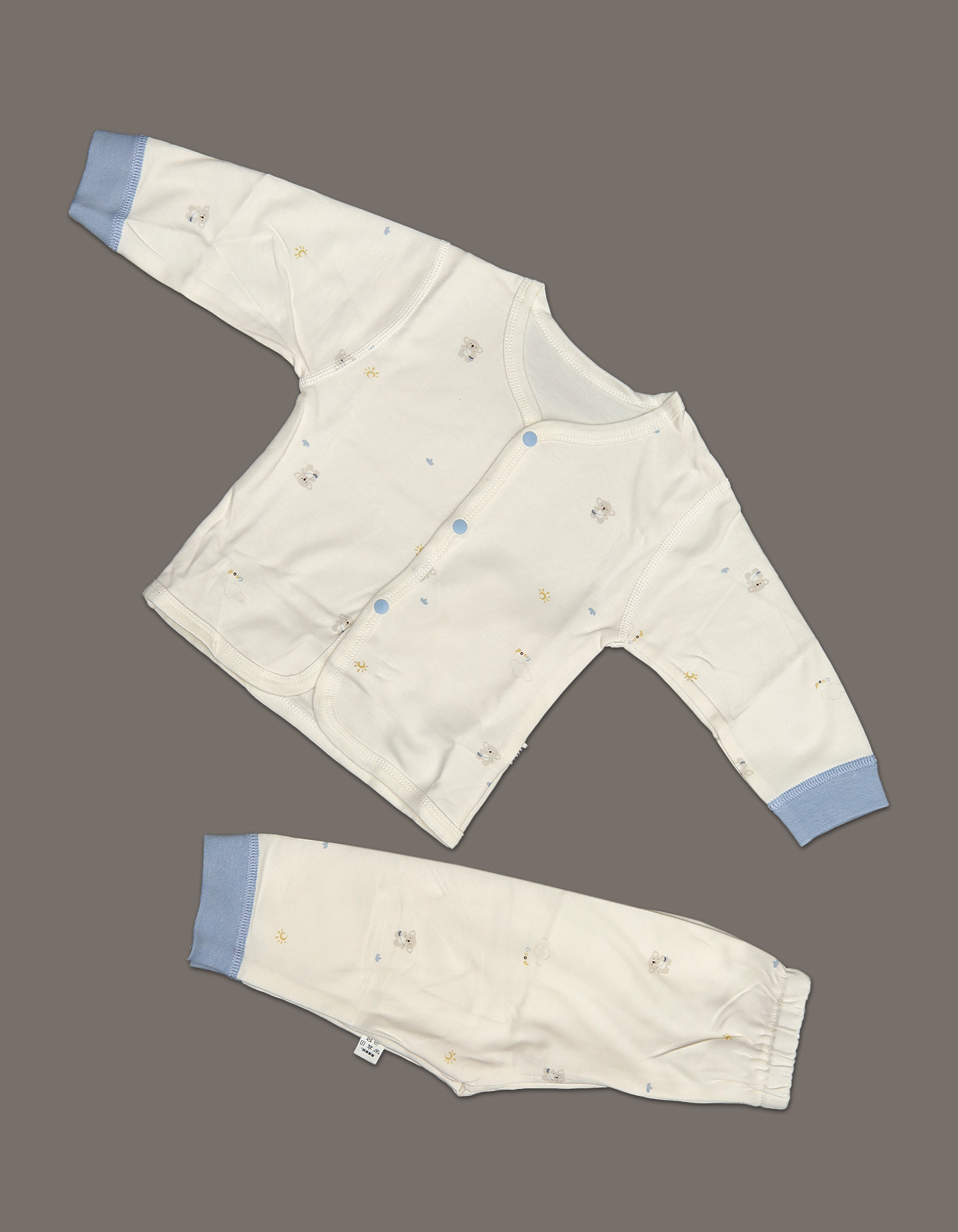 A 2-piece baby clothing set designed with comfort and cuteness in mind. The front-open snap button shirt makes it easy to wear, paired with matching pajamas featuring soft blue cuffs for a sweet finishing touch.