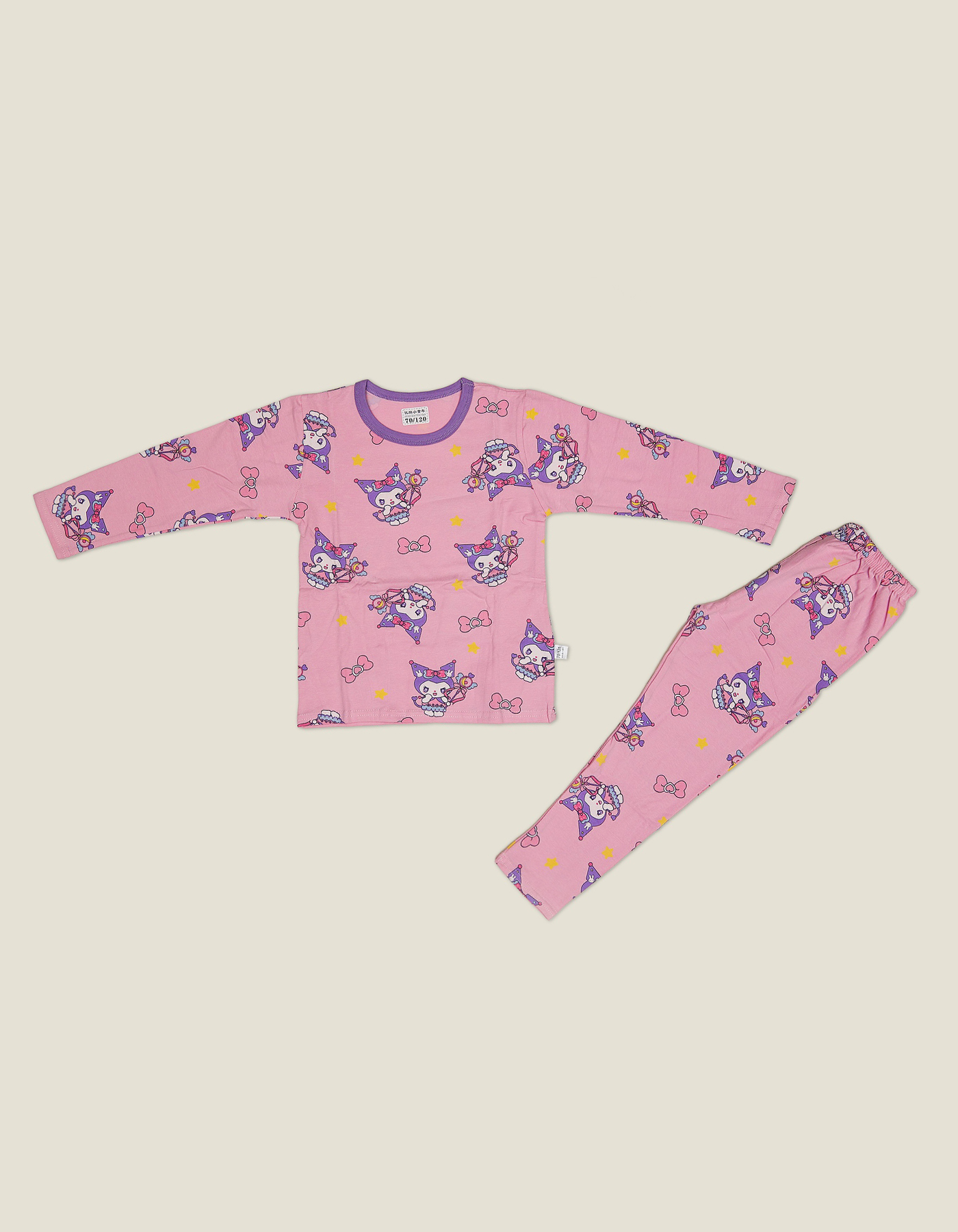 Make bedtime extra adorable with this cozy kitty pajama set. Crafted from soft, breathable fabric, it features a long-sleeve top and matching pants in a playful baby pink shade. The set is decorated with cute kitty faces, stars, and bows, highlighted with a purple neckline for added charm. With a stretchy waistband and comfy fit, its perfect for sleep, lounging, or playful evenings at home.