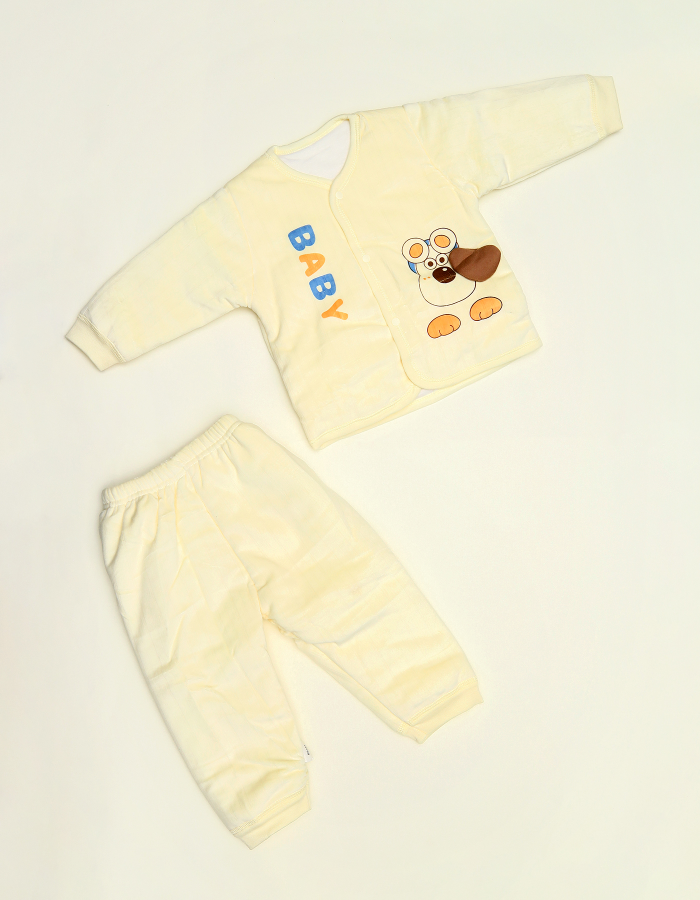 Warm quilted baby suit available in Carrot, Sky Blue, and Yellow. Includes a buttoned jacket with dog print and matching pants. Perfect for colder days.