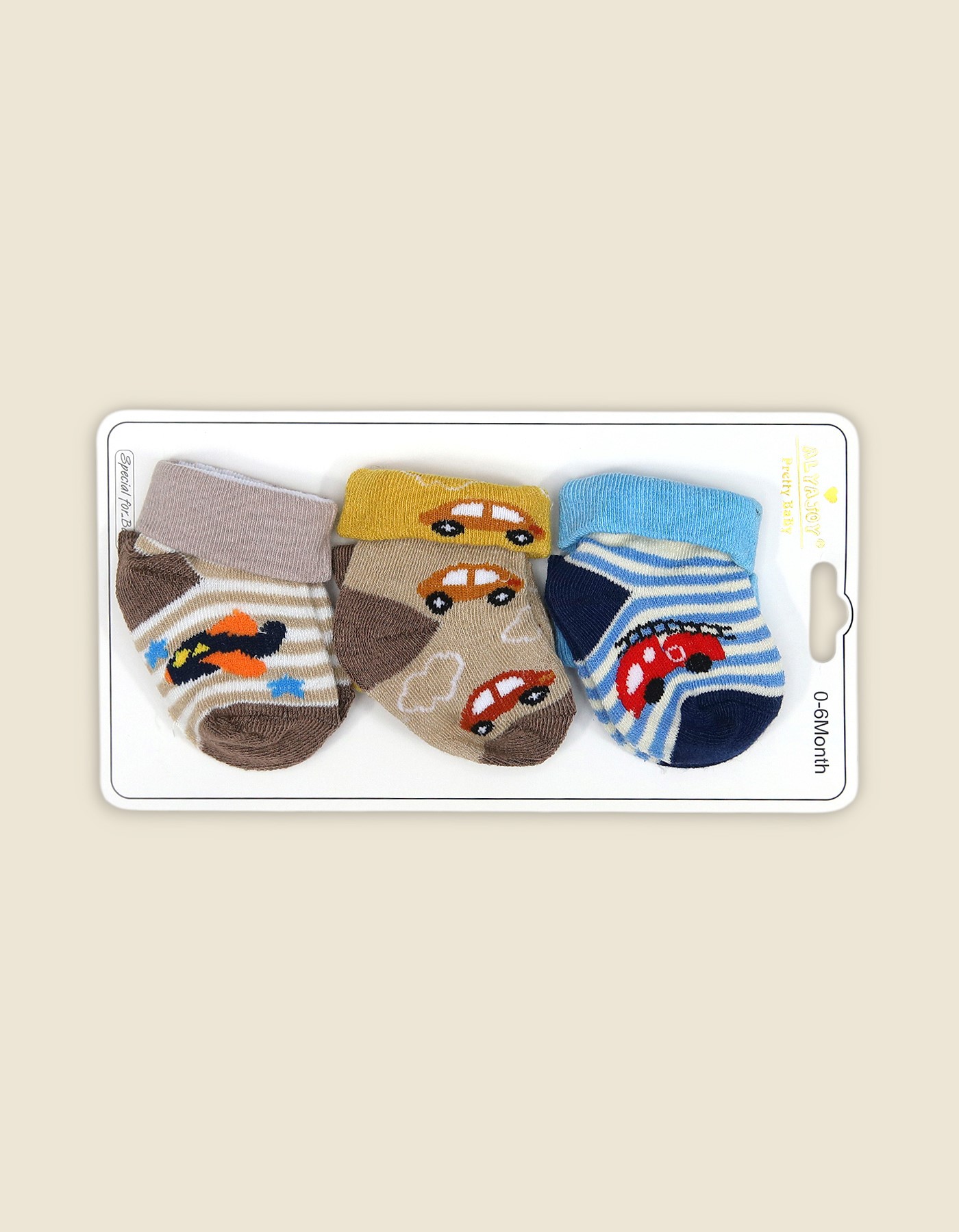 A set of three baby socks in playful car and animal designs. Soft cotton blend, suitable for newborns up to 6 months. Comfortable for daily wear and easy to care for.