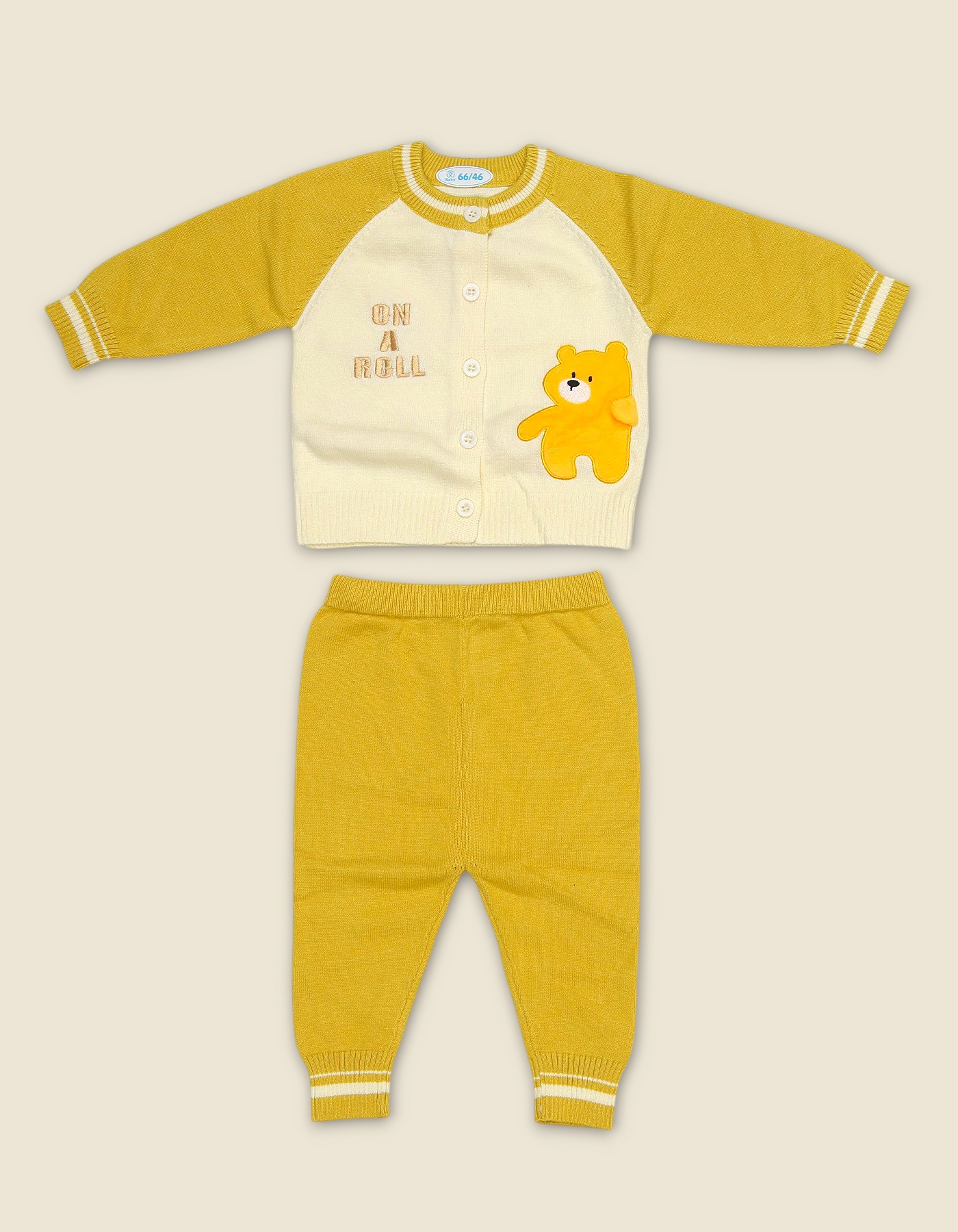Adorable baby suit with bear applique and ON A ROLL embroidery. Perfect for daily wear and gifting