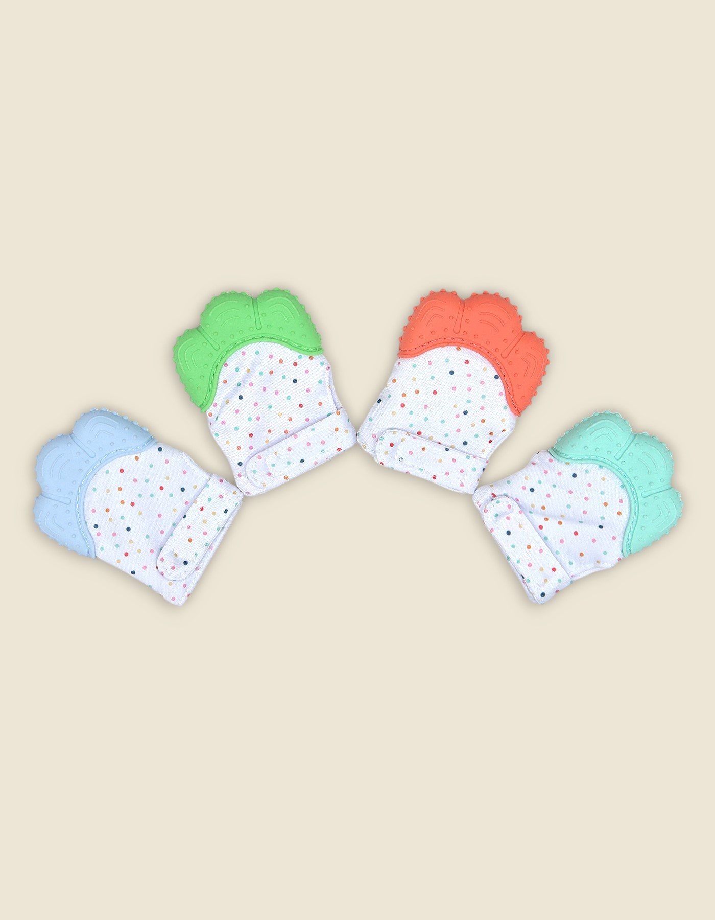 Soft fabric mittens with silicone teething tops to soothe sore gums while protecting little hands from scratching. Ideal for babies who love to chew their fingers. Adjustable hook and loop strap keeps the mitten secure. Food grade BPA free silicone with gentle textures. Easy to wash and reuse. Assorted colors shown.