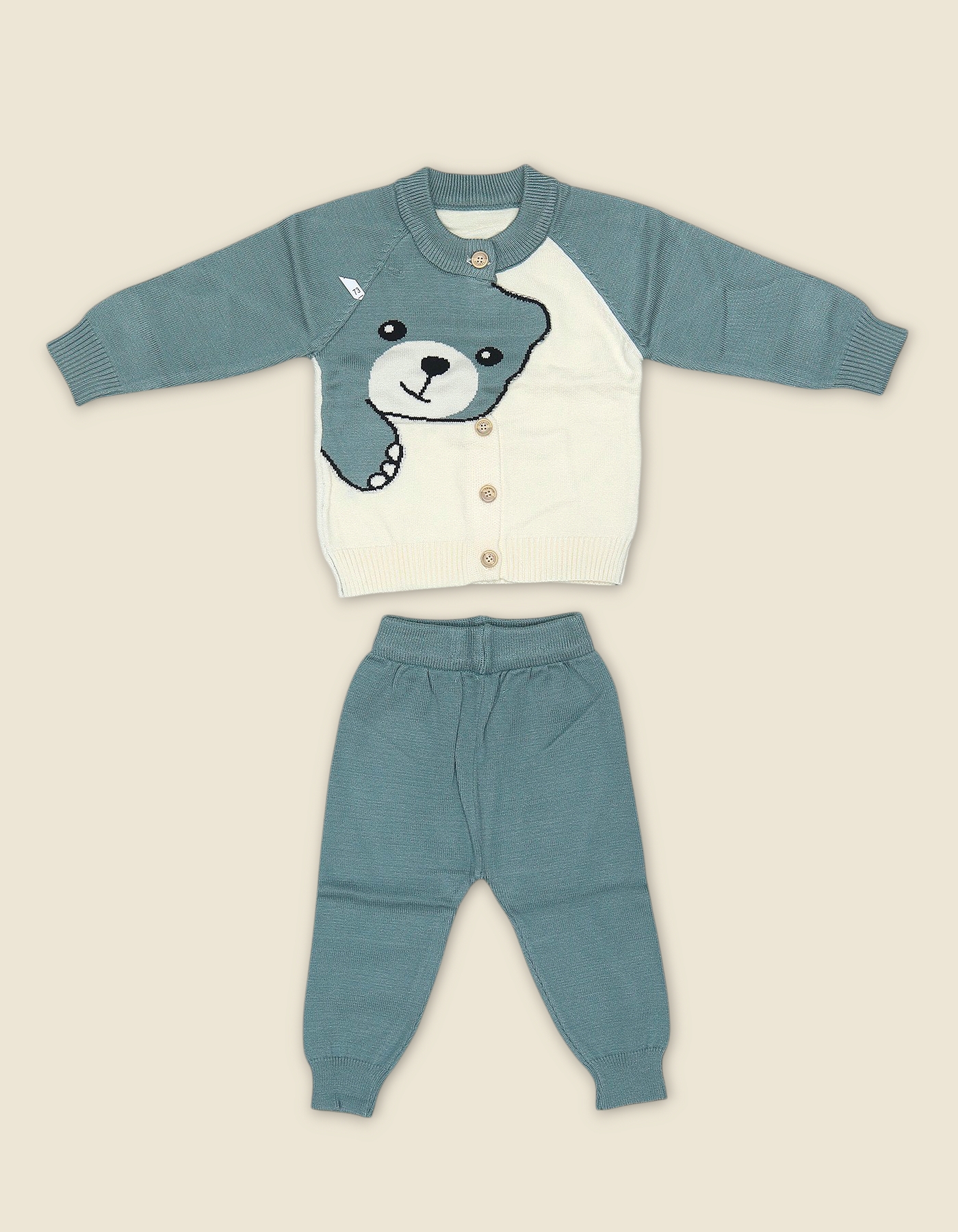 Adorable woolen outfit for boys with bear face sweater and matching pants. Features button-up front and soft knit fabric for cozy winter wear.
