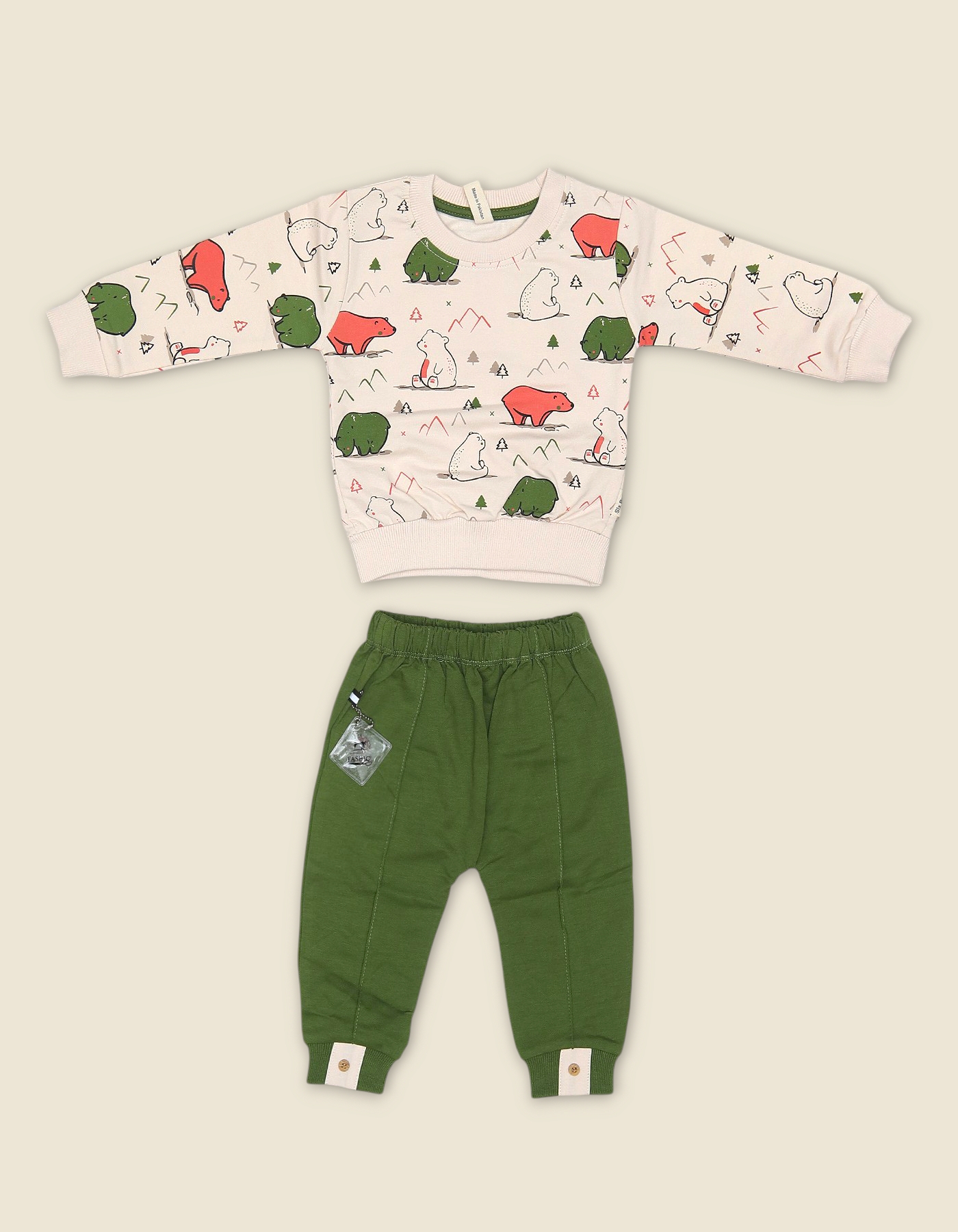 Soft and cozy baby outfit with bear and mountain print. Includes long sleeve sweatshirt and matching pants in solid colors.