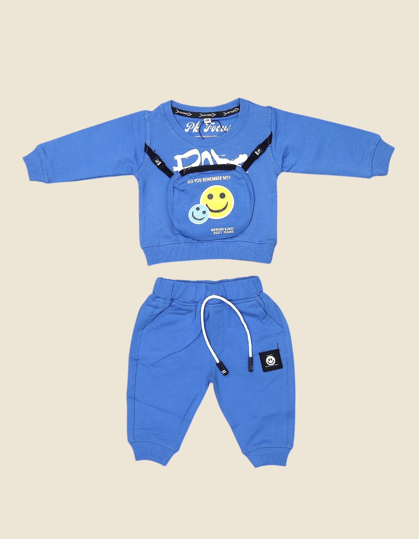 Bring cheerful vibes to your boys wardrobe with this trendy 2-piece smiley-themed suit. The set features a playful sweatshirt with an attached mini pouch design and a pair of comfy jogger pants. Available in both blue and brown, this outfit combines casual comfort with a fun, expressive style perfect for everyday wear, playdates, or outings.