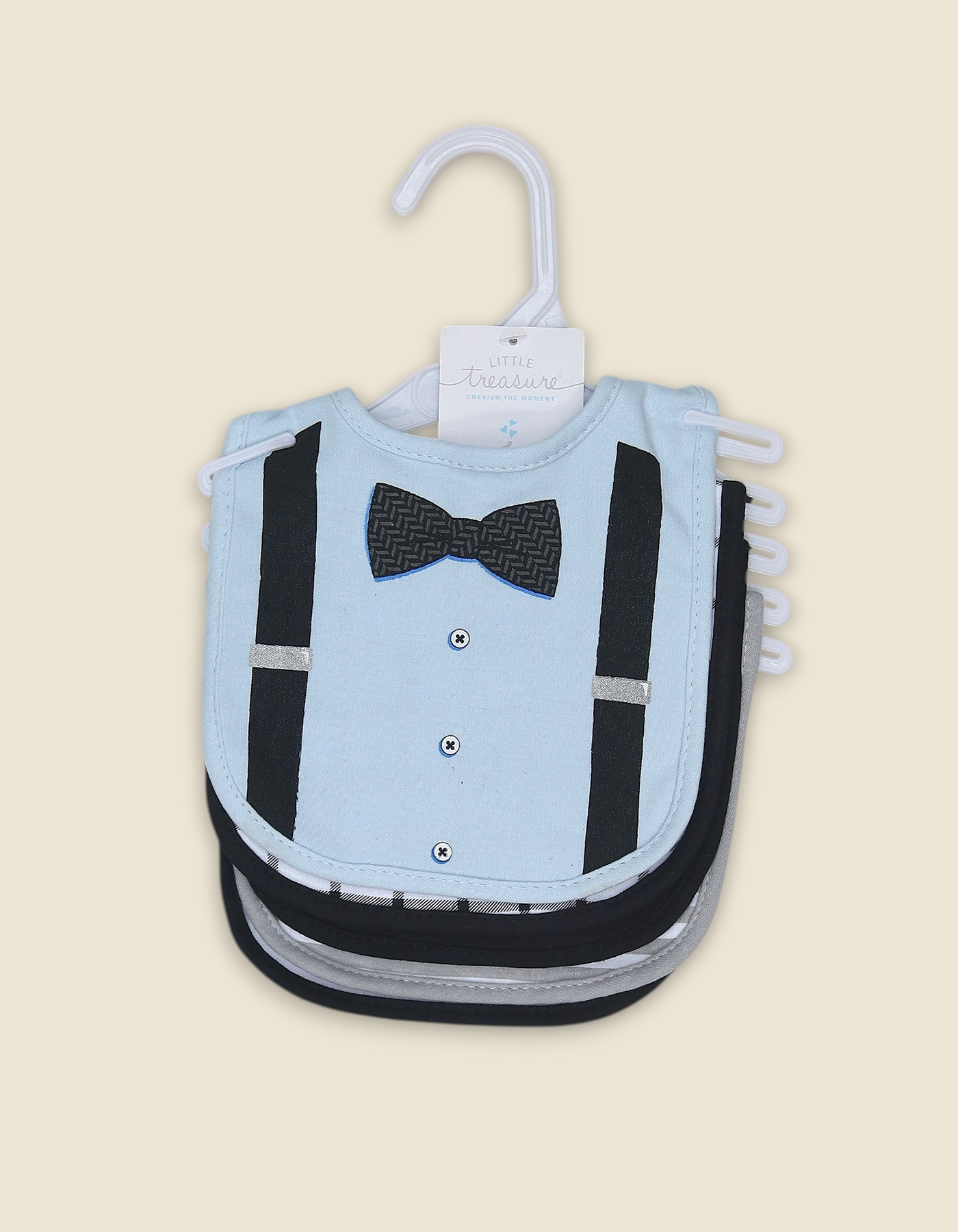 Stylish baby bibs with printed bow tie and suspenders design. Perfect for special occasions, feeding and gifting.