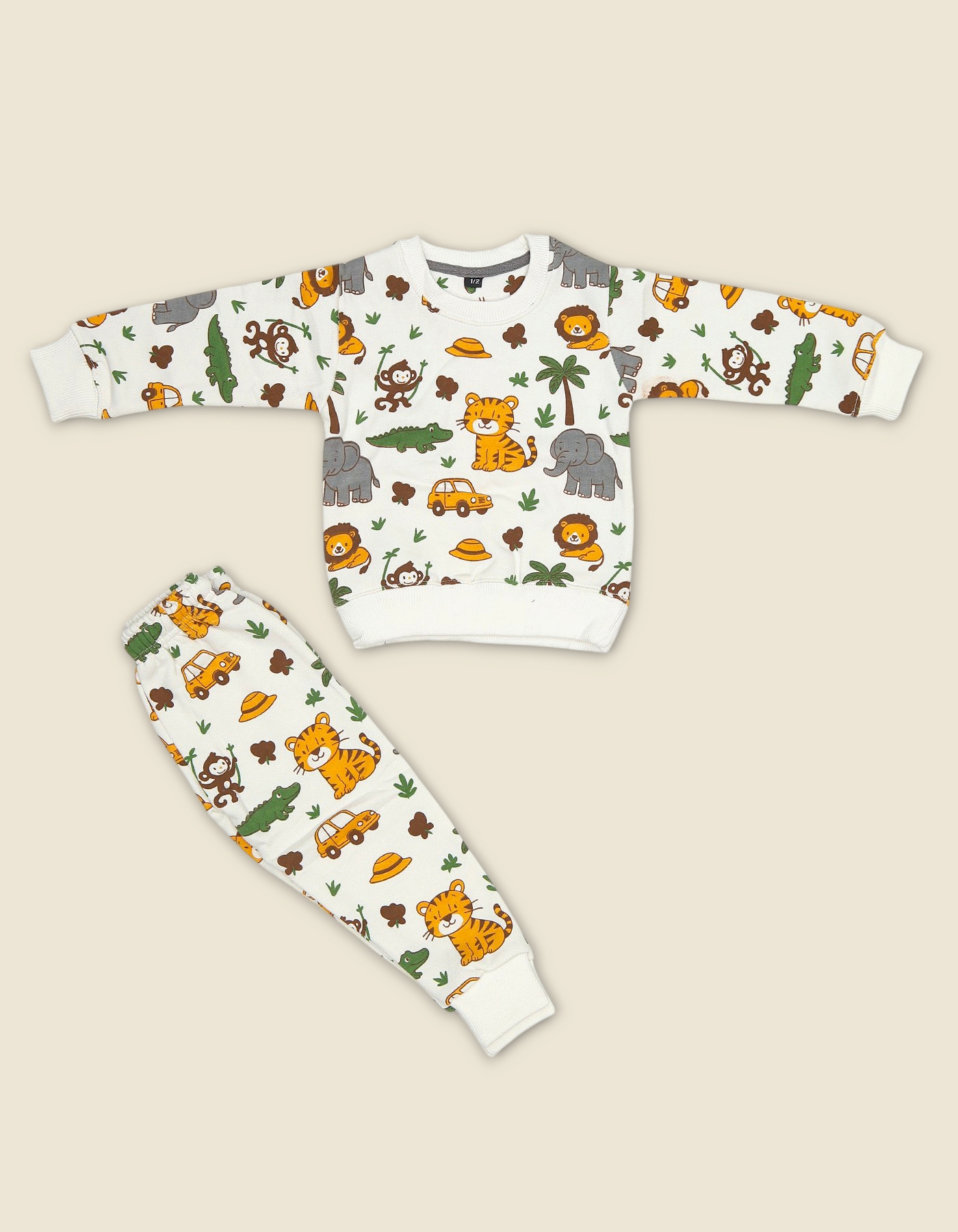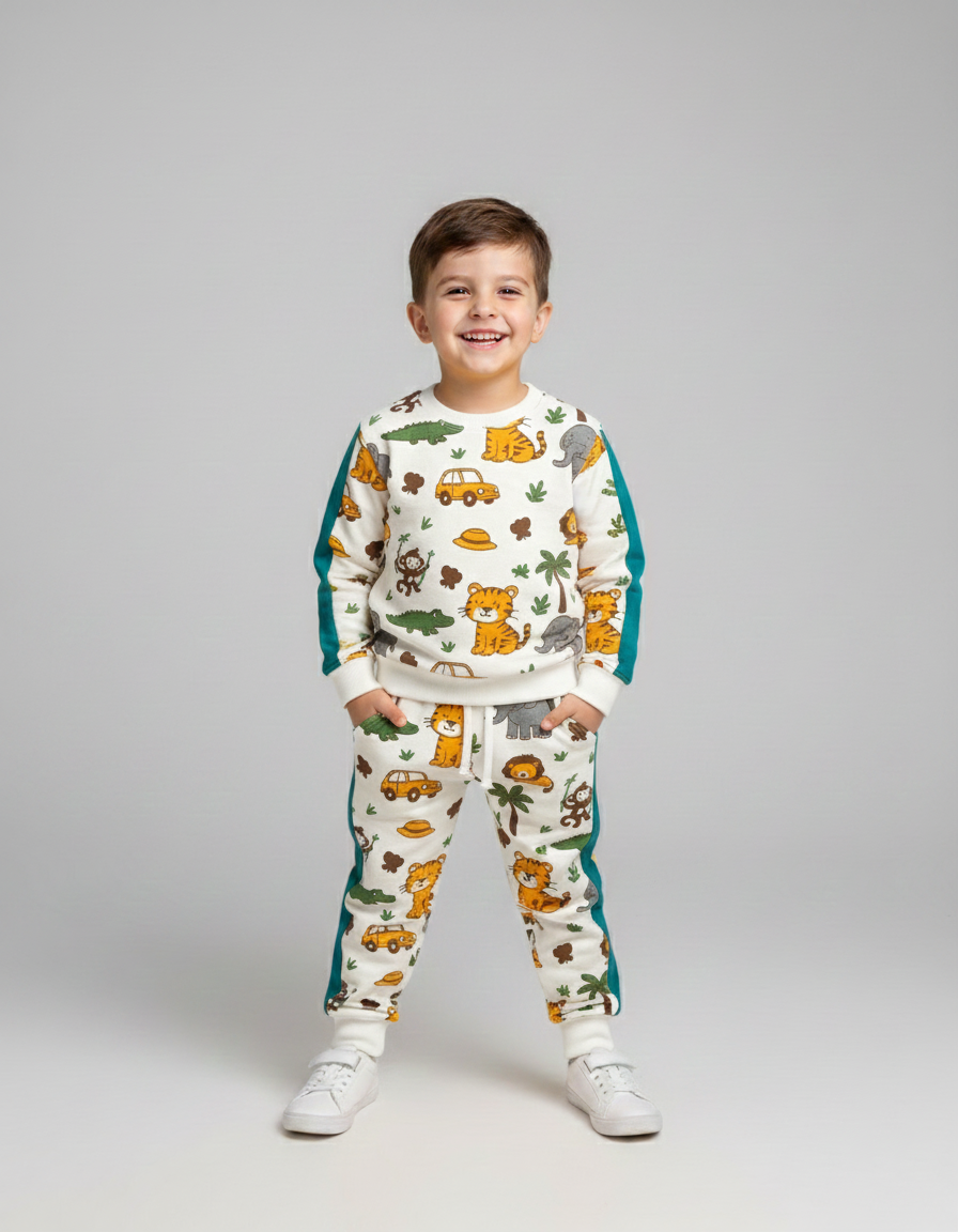 Soft boys pajama set with colorful jungle animal print. Perfect for bedtime comfort and gifting