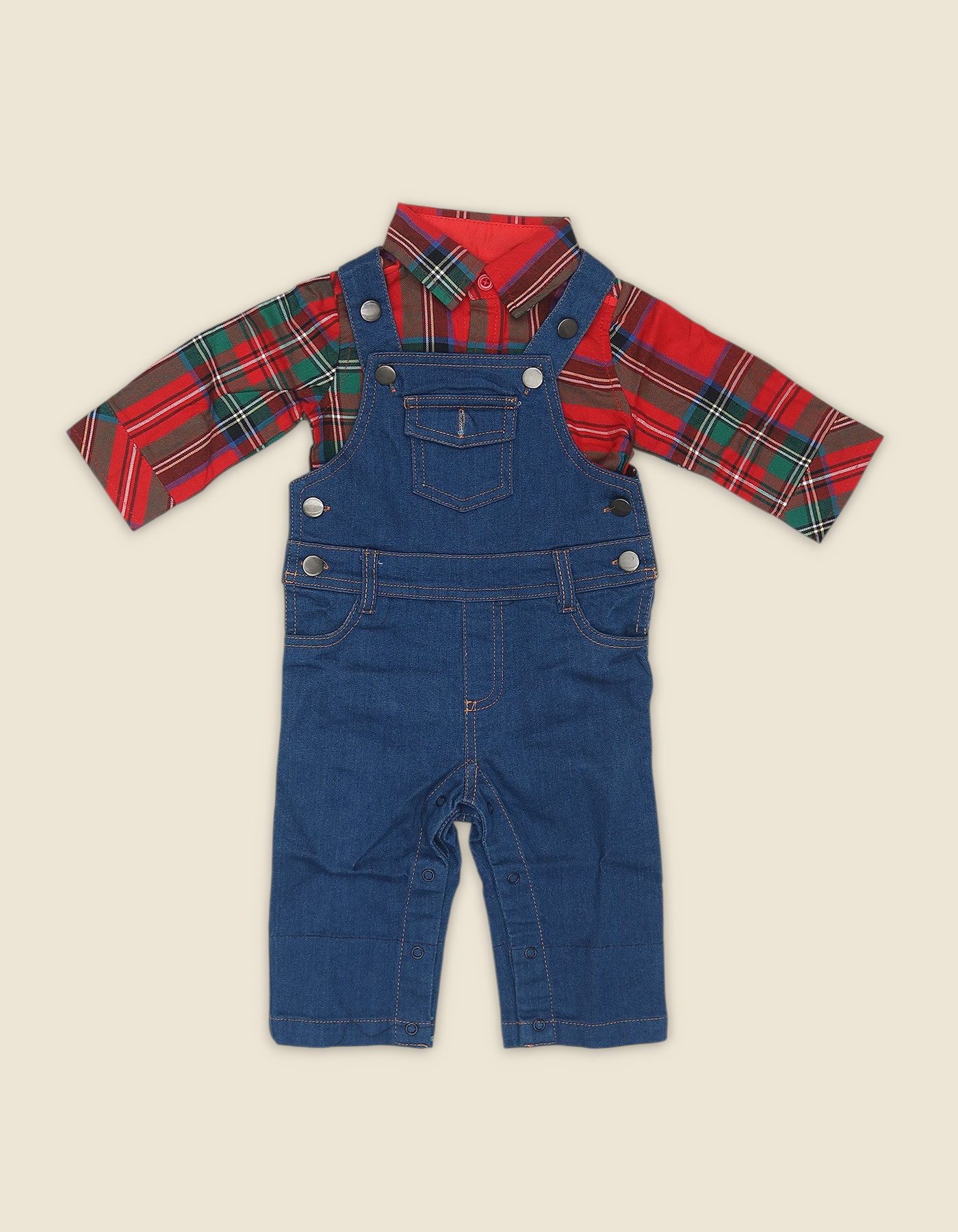 A cute boys outfit featuring a red plaid long sleeve shirt and a matching blue denim dungaree set. Comfortable, durable, and perfect for chilly days.