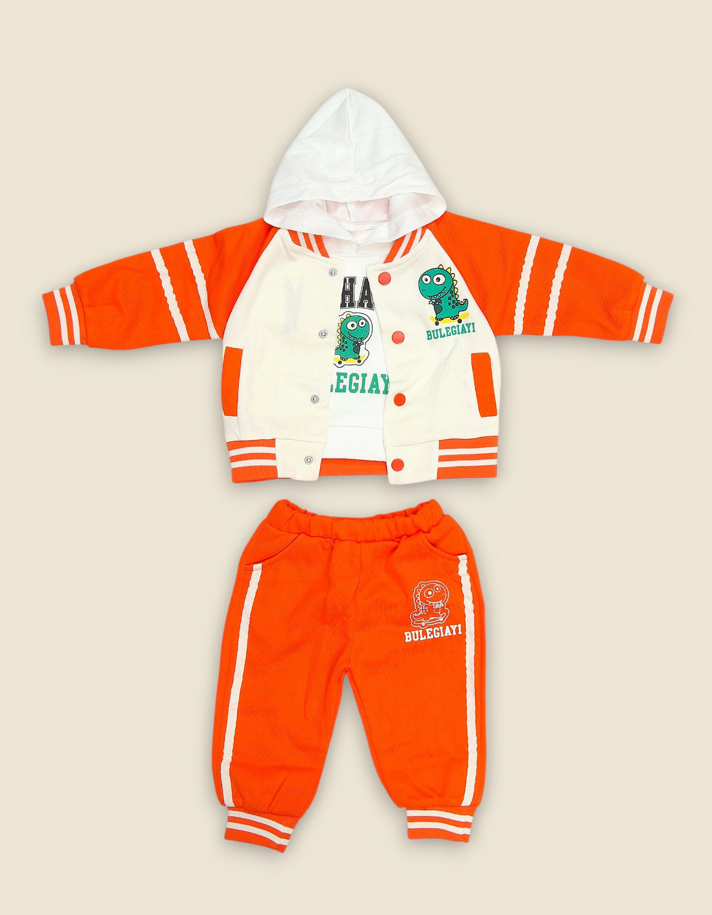 Fun and colorful boys suit with cartoon monster design. Includes hooded jacket t shirt and matching pants. Perfect for casual wear outings and gifting
