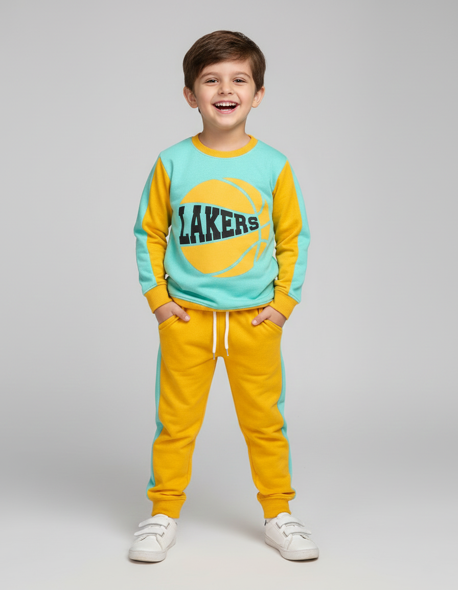 Sporty boys track suit with Lakers basketball graphic sweatshirt and matching pants. Perfect for casual wear playtime and gifting