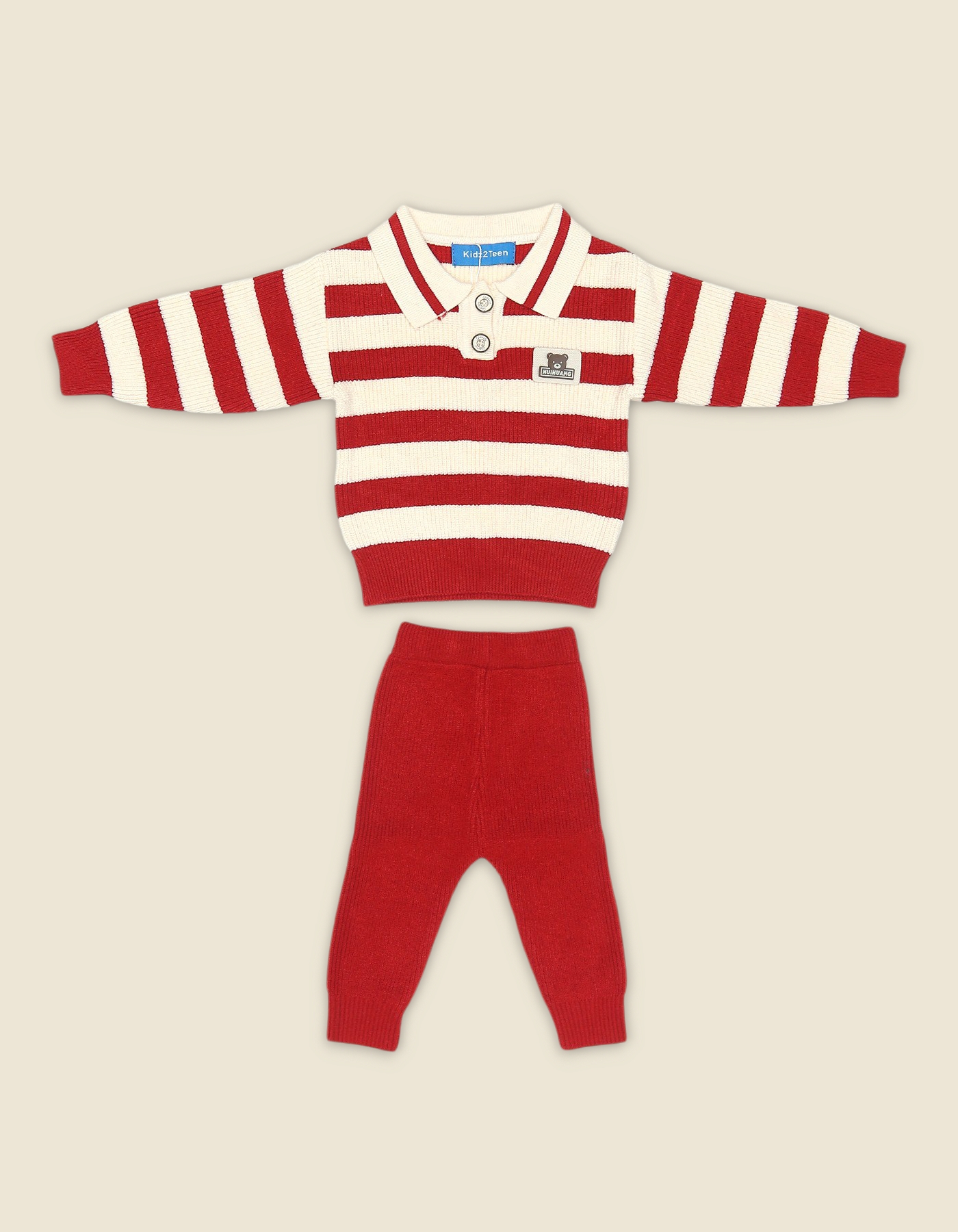 A cozy boys woolen knit suit featuring a red and cream striped polo-style top and matching red knit pants. Soft, warm, and durable for chilly days.