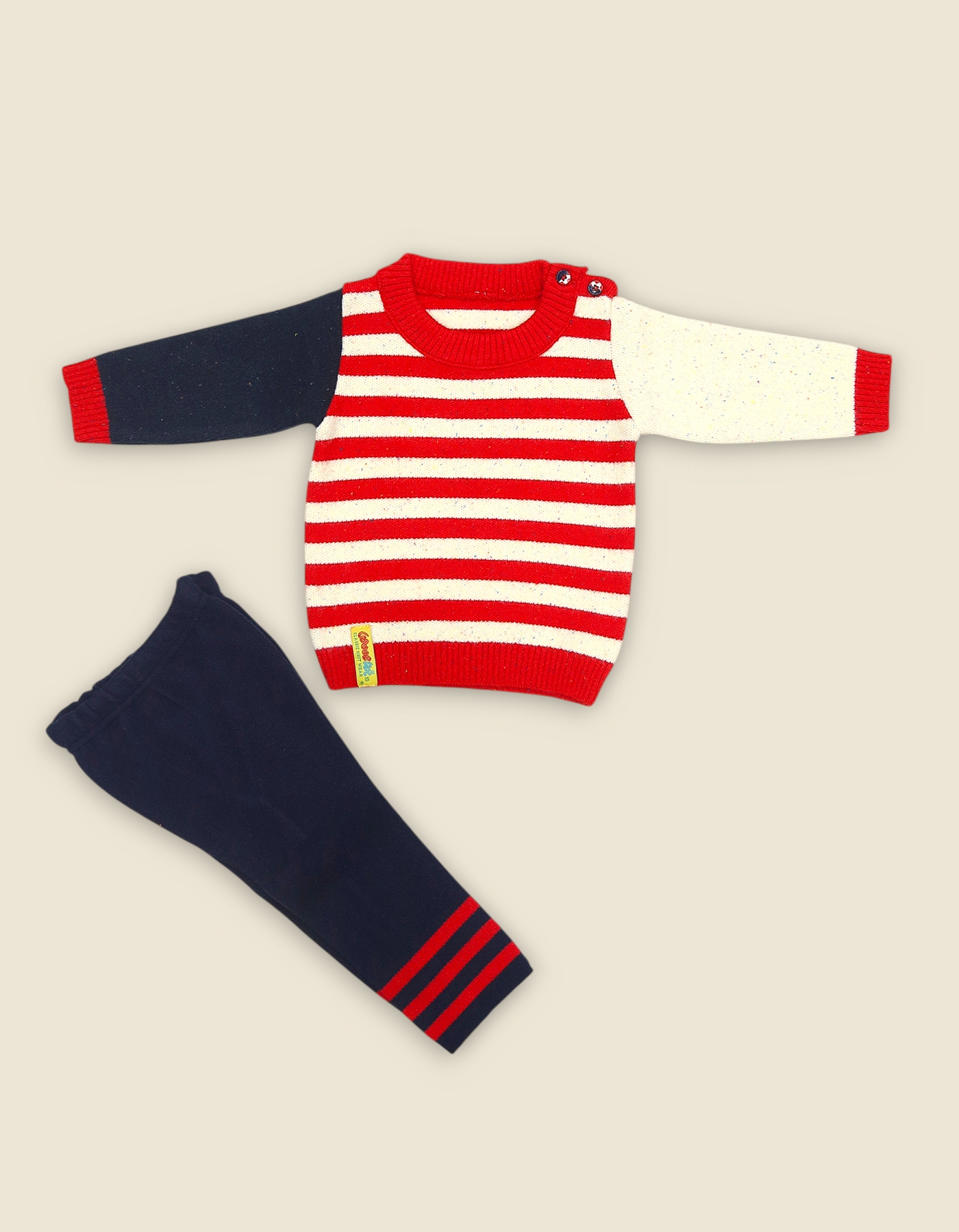Stylish boys woolen suit with striped sweater and matching pants. Perfect for winter wear outings and gifting