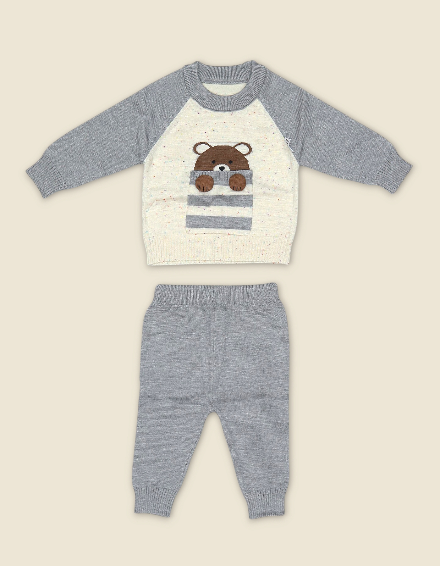 Adorable woolen baby outfit with bear-in-pocket sweater and matching pants. Designed for warmth, comfort and playful winter style.