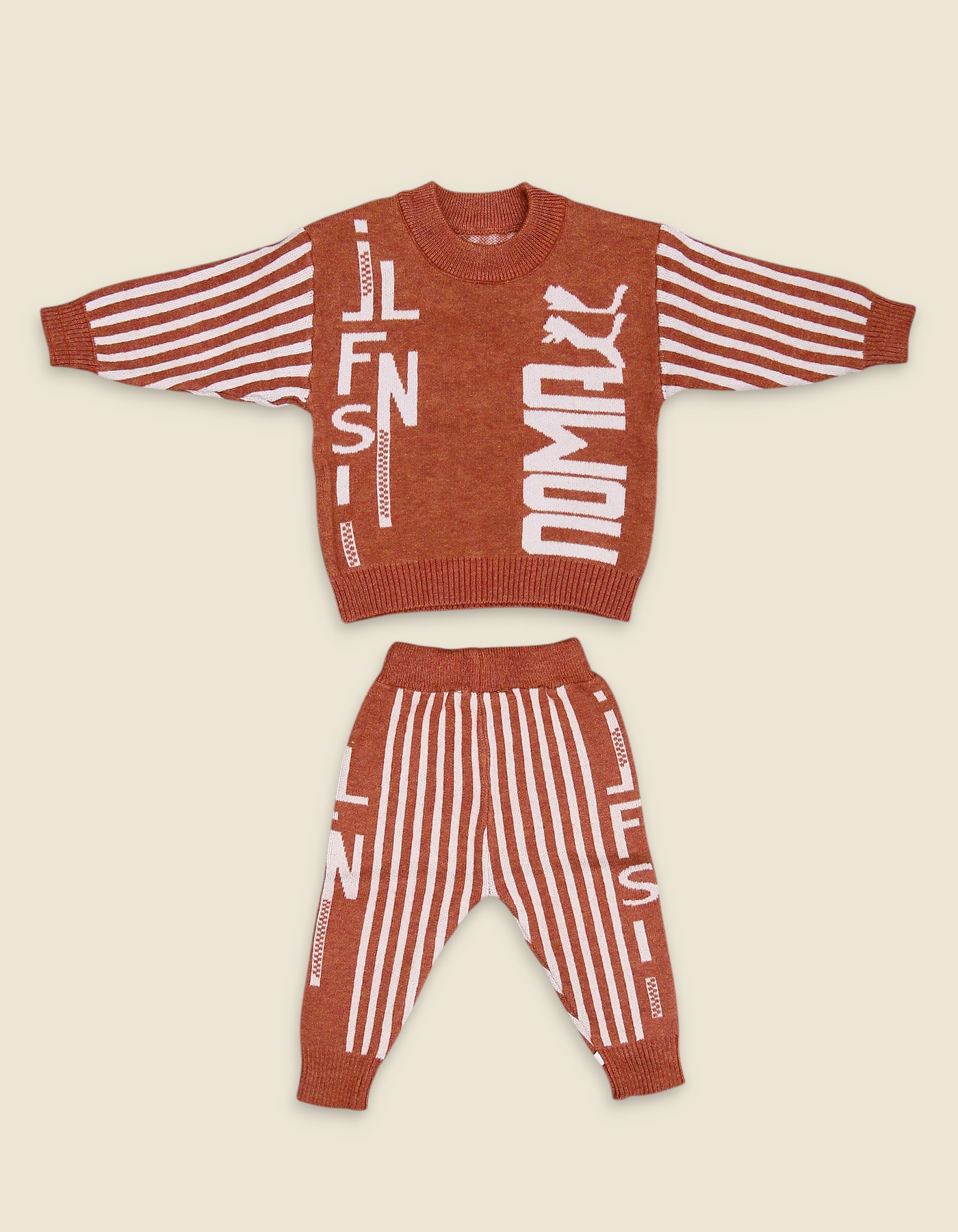 Keep your little one warm and stylish with this modern brown woolen knit suit. The sweater features bold letter designs and striped sleeves for a trendy look, while the matching pants come with vertical stripes and letter patterns, creating a coordinated and fashionable winter outfit. Soft, cozy, and playful, this set is perfect for casual wear, outings, and festive winter days.