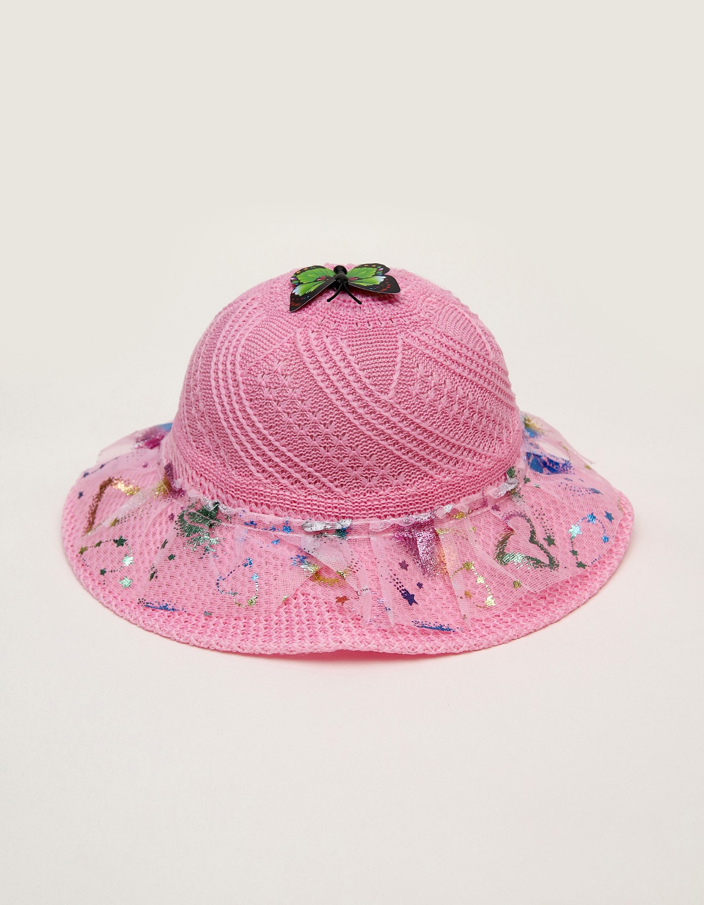 Add a touch of magic to your little ones outfit with this adorable summer hat. Featuring a delicate lace design, shimmering star accents, and a cute 3D butterfly on top, this hat is perfect for sunny outings, birthdays, or playdates.