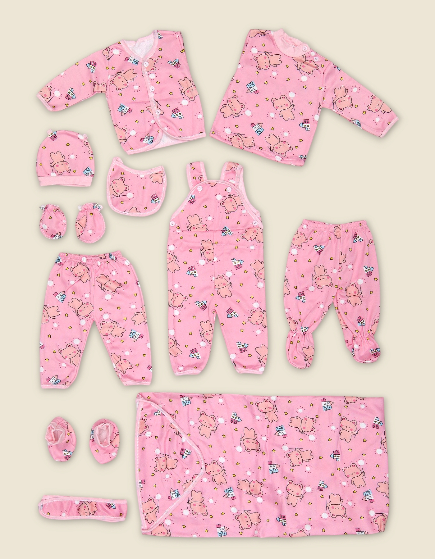 Extended starter set for newborns with cartoon bear print. Includes full clothing and accessories for comfort, warmth and gifting.