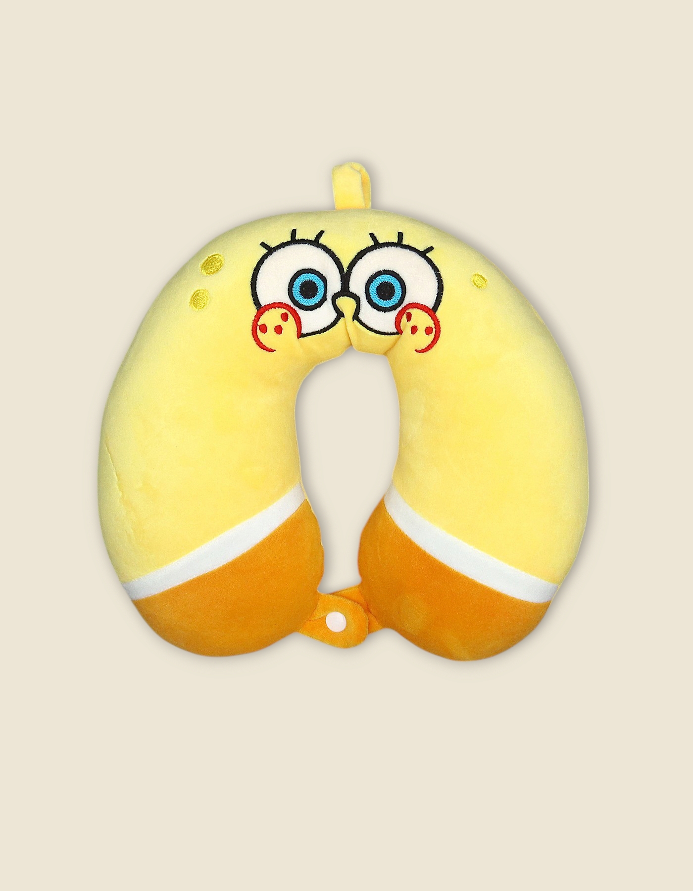 A vibrant yellow and orange color-blocked design featuring iconic, wide-eyed cartoon character embroidery.