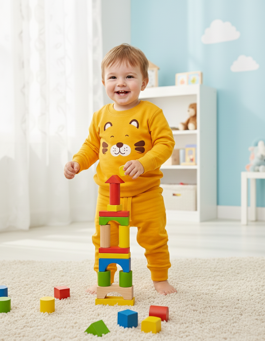 Fun and playful, this boys tracksuit is designed to bring smiles. Featuring a bright yellow color and a cute tiger face print, it is perfect for kids who love cheerful and comfortable outfits.