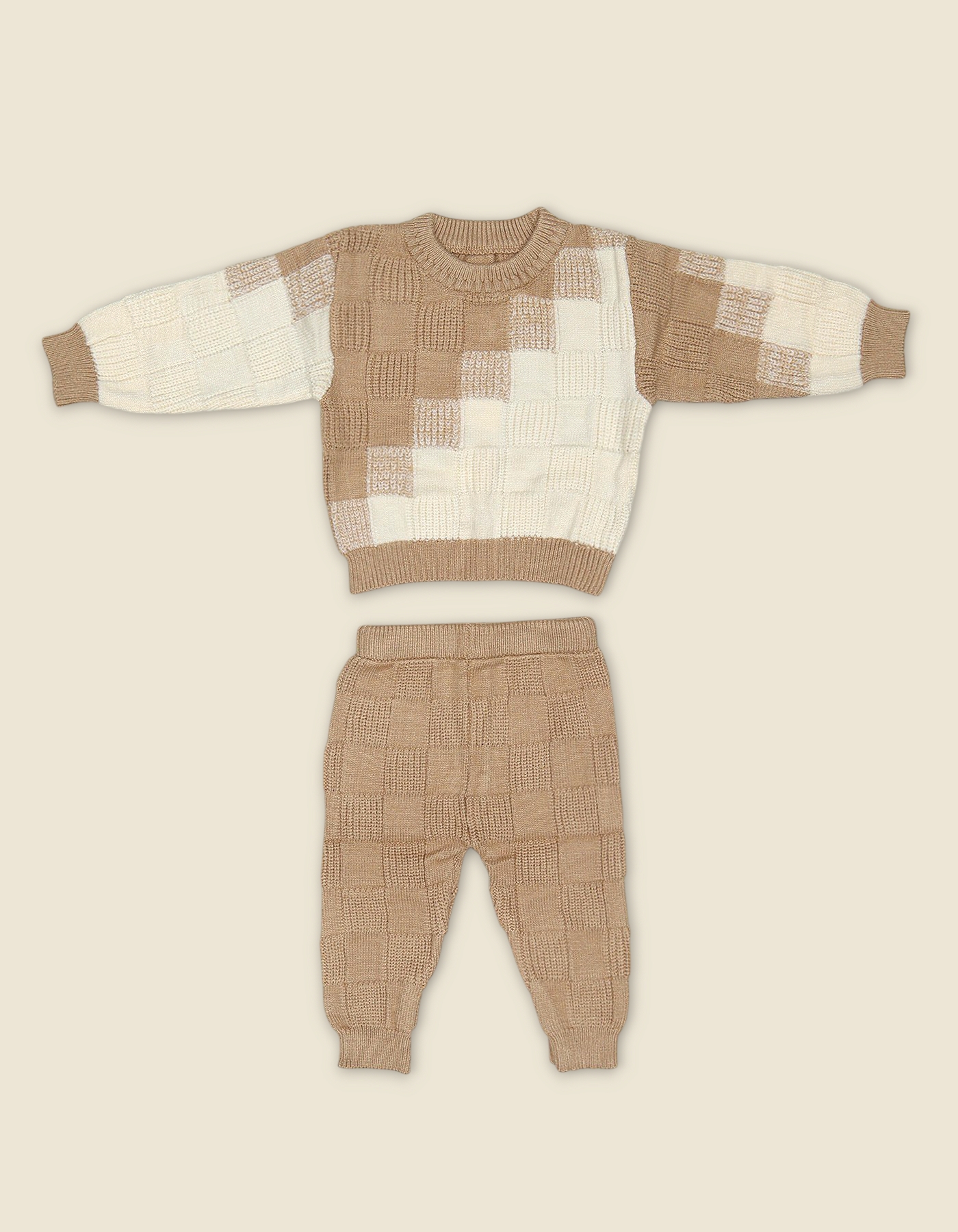 Cozy boys woolen outfit with checkered sweater and textured pants. Features soft knit fabric and neutral tones for stylish winter comfort.