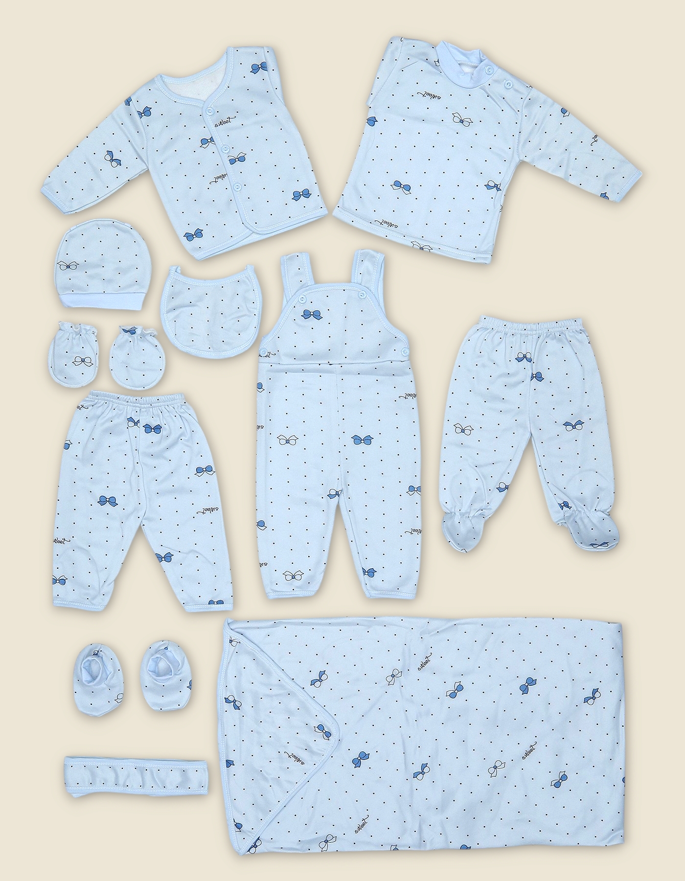 Extended starter set for newborns with cherry and bow print. Includes full clothing and accessories for comfort, warmth and gifting.