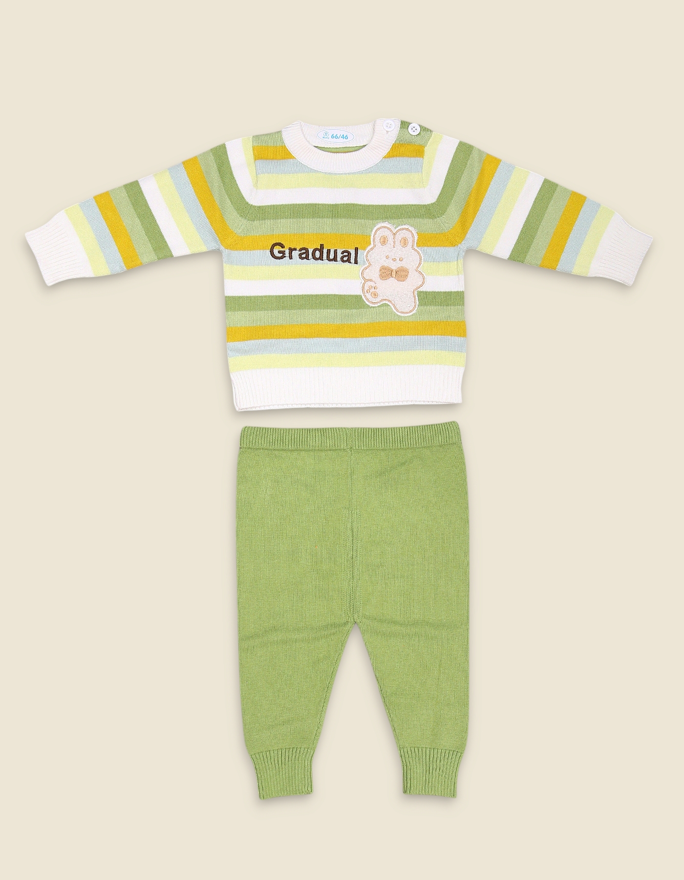 Brighten up winter days with this cheerful woolen knit suit for boys. The striped sweater features bold multi-color or parrot-green stripes with an adorable bunny patch and Gradual text detail. It comes with matching knit pants in solid colors blue or green, making this set cozy, playful, and perfect for winter wear.