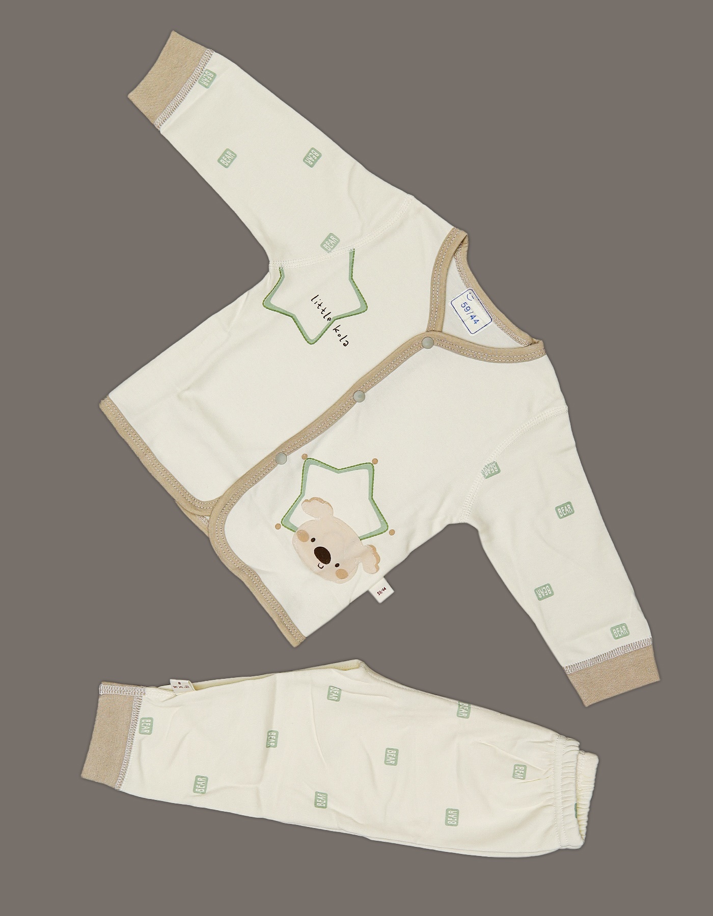 Soft cream two-piece pajama set with beige cuffs and green accents, featuring a cute bear motif. Snap button closure and comfortable fit for babies.