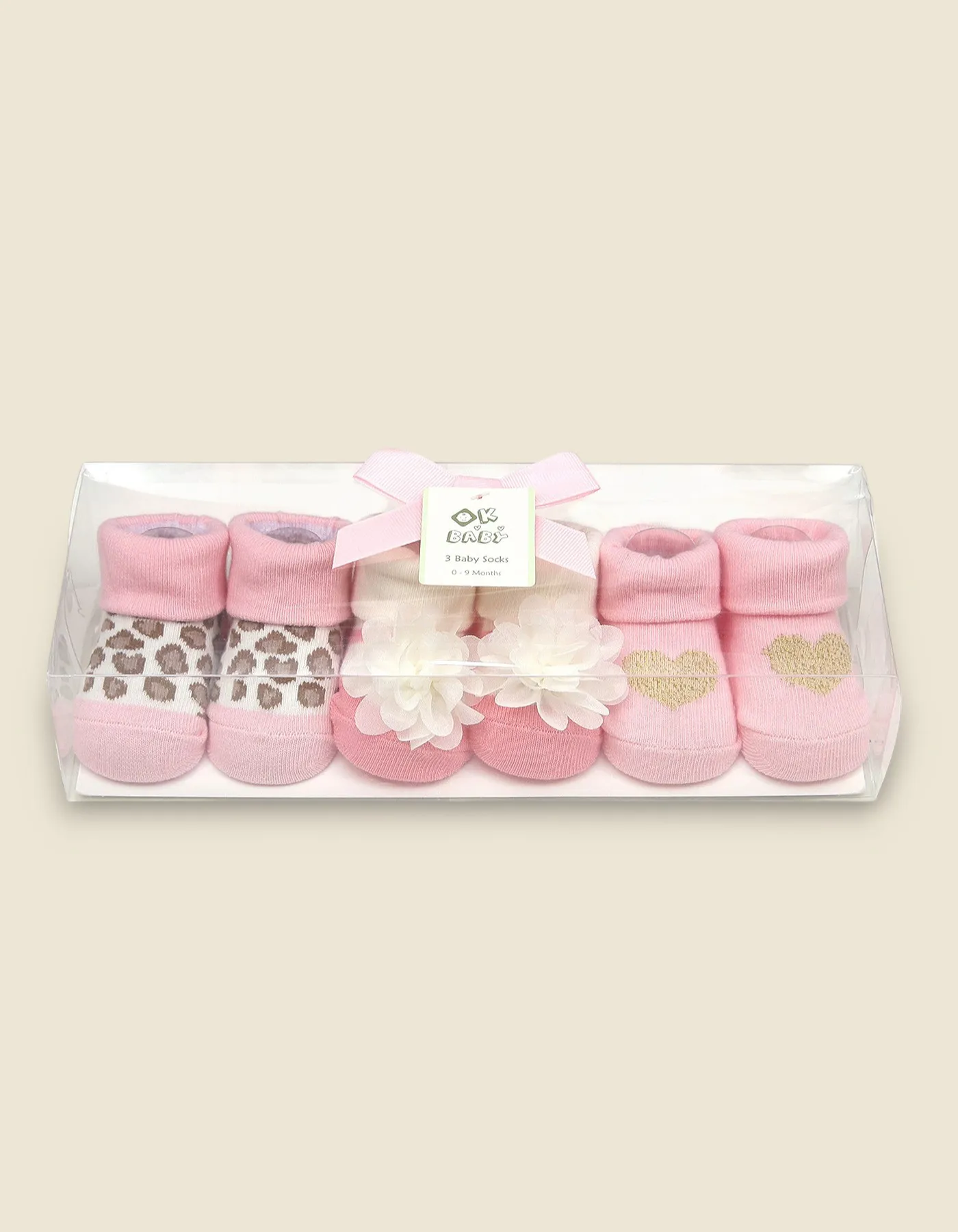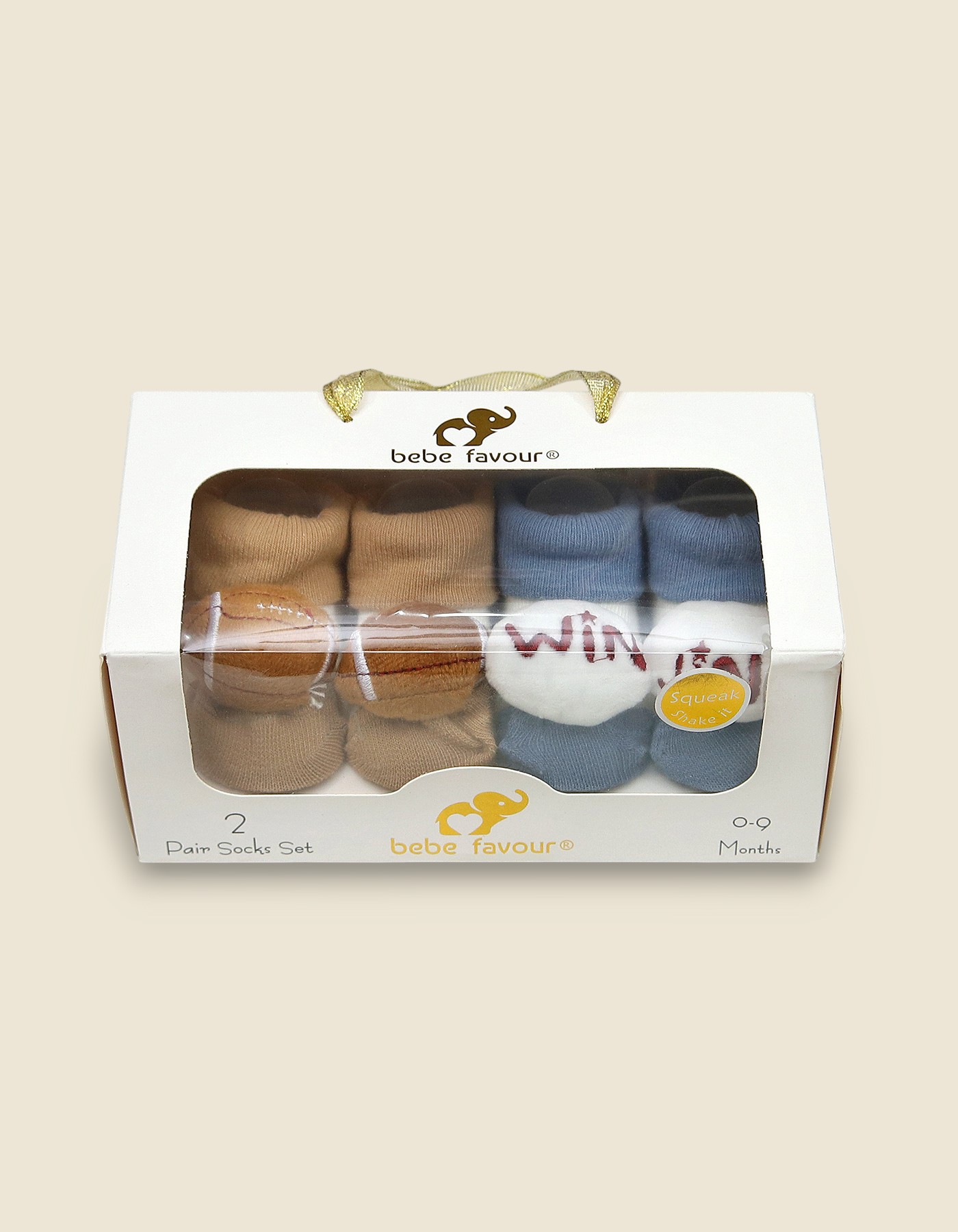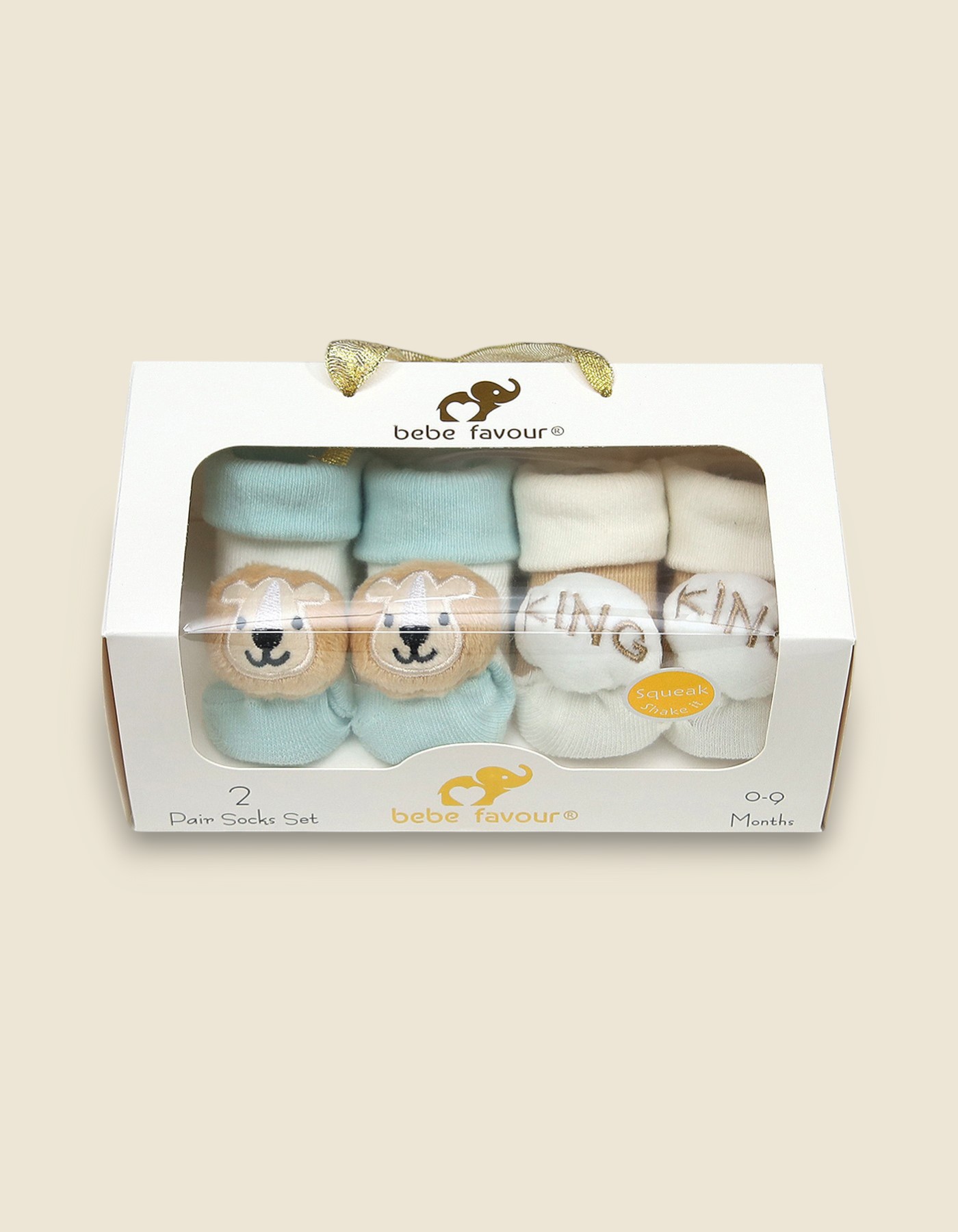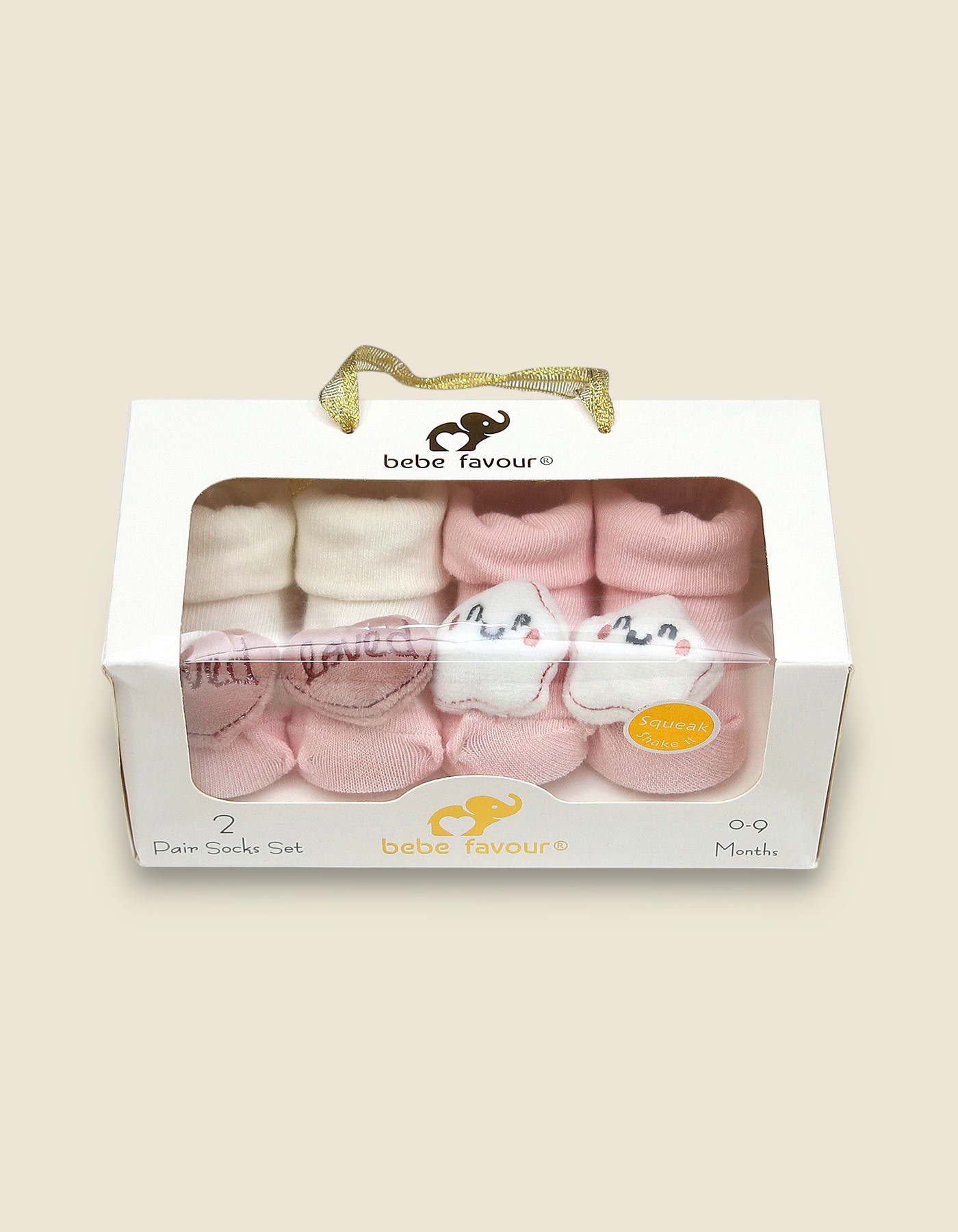 A two pair baby socks gift set in soft pastel colors with cute animal or character details. Comfortable and gentle on newborn skin. Ideal for gifting or everyday wear for infants 0 to 9 months.