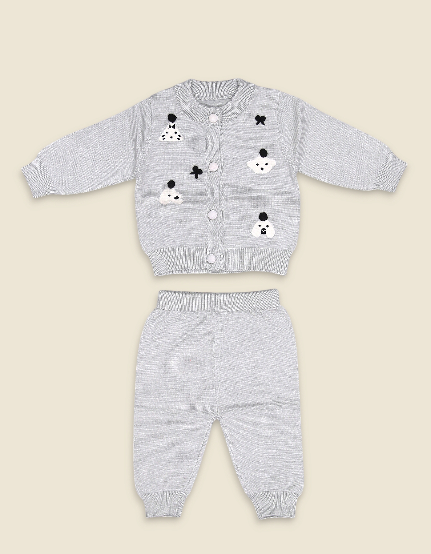 The Cute Bear Grey Woolen Suit is a stylish and cozy outfit crafted to keep your little one warm during the winter season. This 2-piece set features a soft knitted cardigan decorated with adorable bear and bow patterns, paired with matching woolen pants for a complete look. Made from a premium wool blend, this outfit is soft on the skin, breathable, and ensures all-day comfort. The cardigan includes front button closure for easy wear, while the matching pants have a stretchable waistband and cuffed hems for a snug and secure fit. Perfect for casual wear, playdates, and family gatherings, this suit combines warmth, cuteness, and practicality for everyday winter fashion.