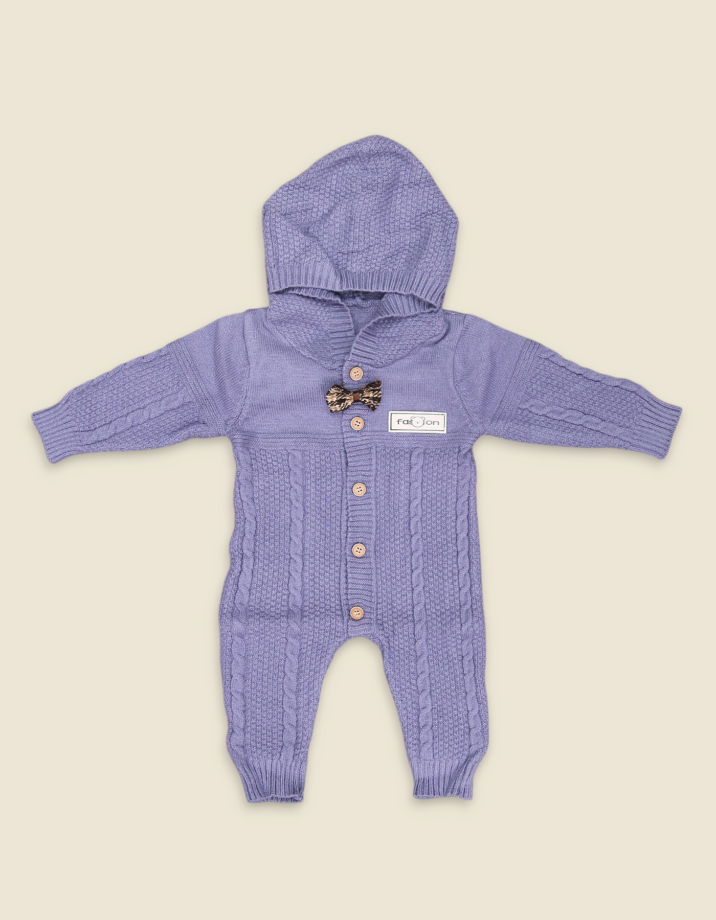 The DArk Grey Knitted Hooded Romper Suit is a cozy and stylish all-in-one outfit designed for baby girls. Crafted from soft knitted fabric, it features a charming cable-knit design, full front button closure, and a warm hood to keep your little one snug. The romper also includes a cute decorative bow detail, adding an extra touch of elegance. Its ribbed cuffs and ankle hems provide a secure fit, making it perfect for both casual wear and special occasions during cooler seasons.
