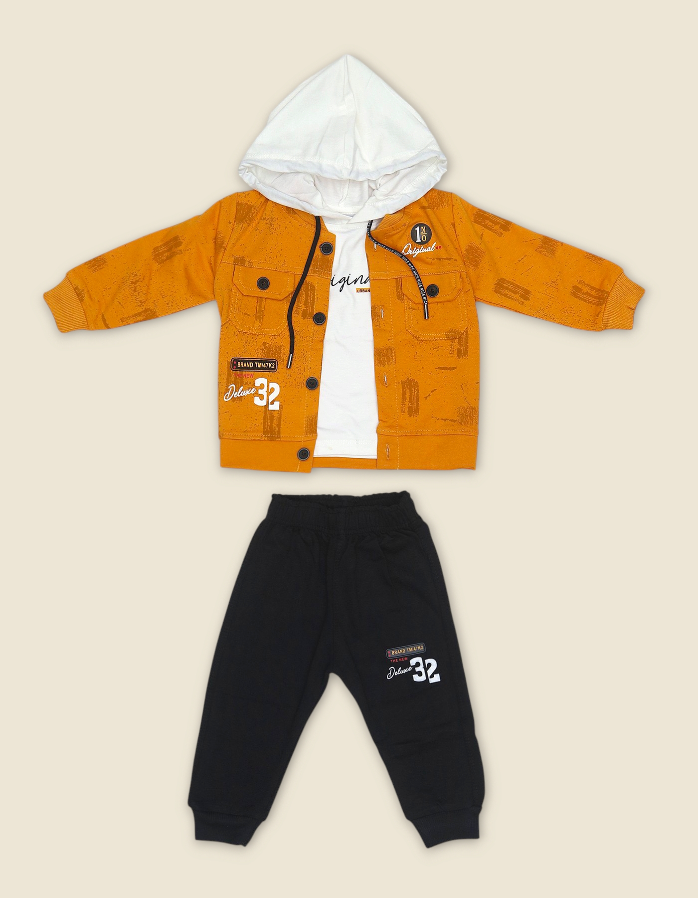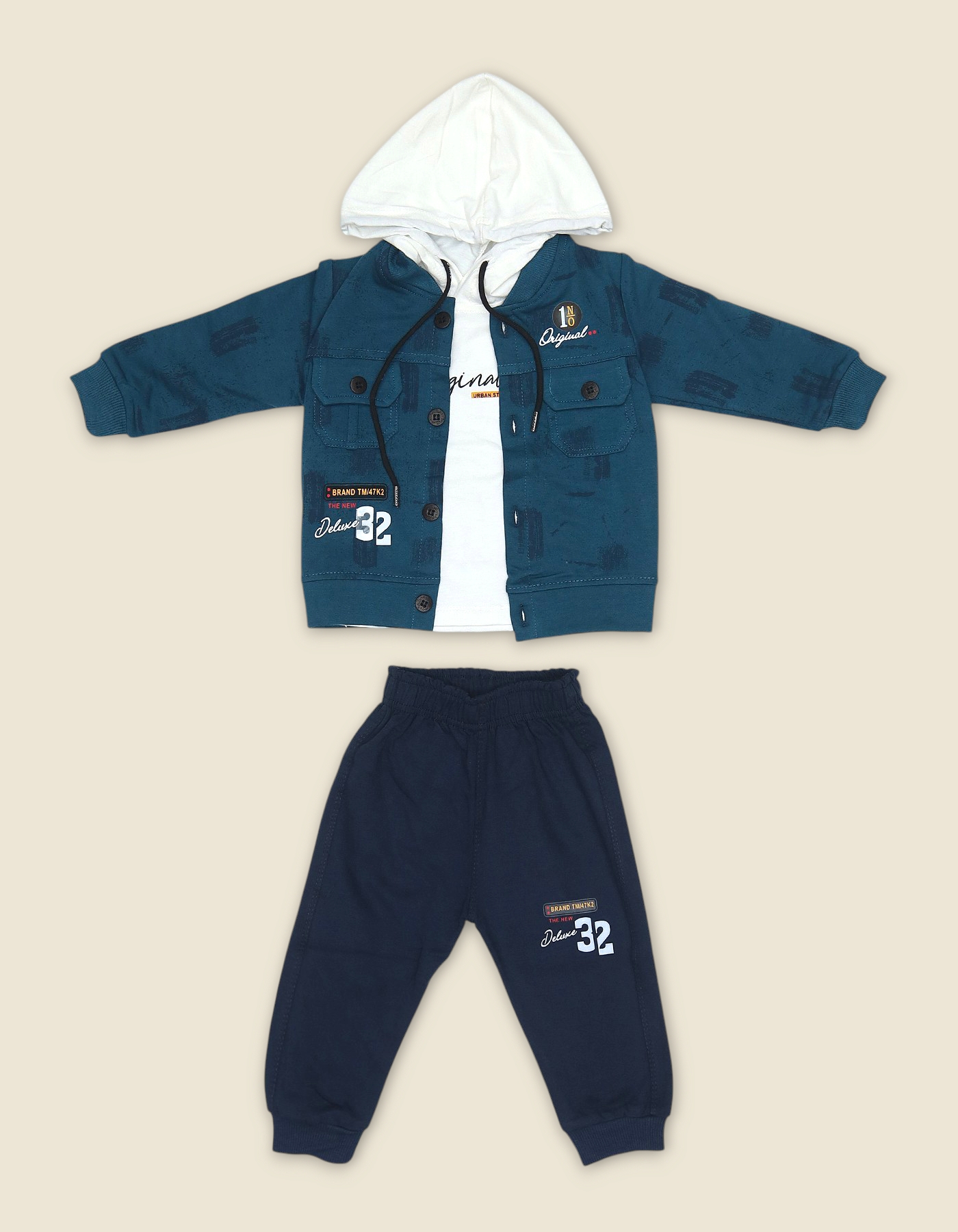 Trendy three piece baby outfit with hooded jacket, t shirt and pants. Features embroidered text and sporty design for a stylish look.
