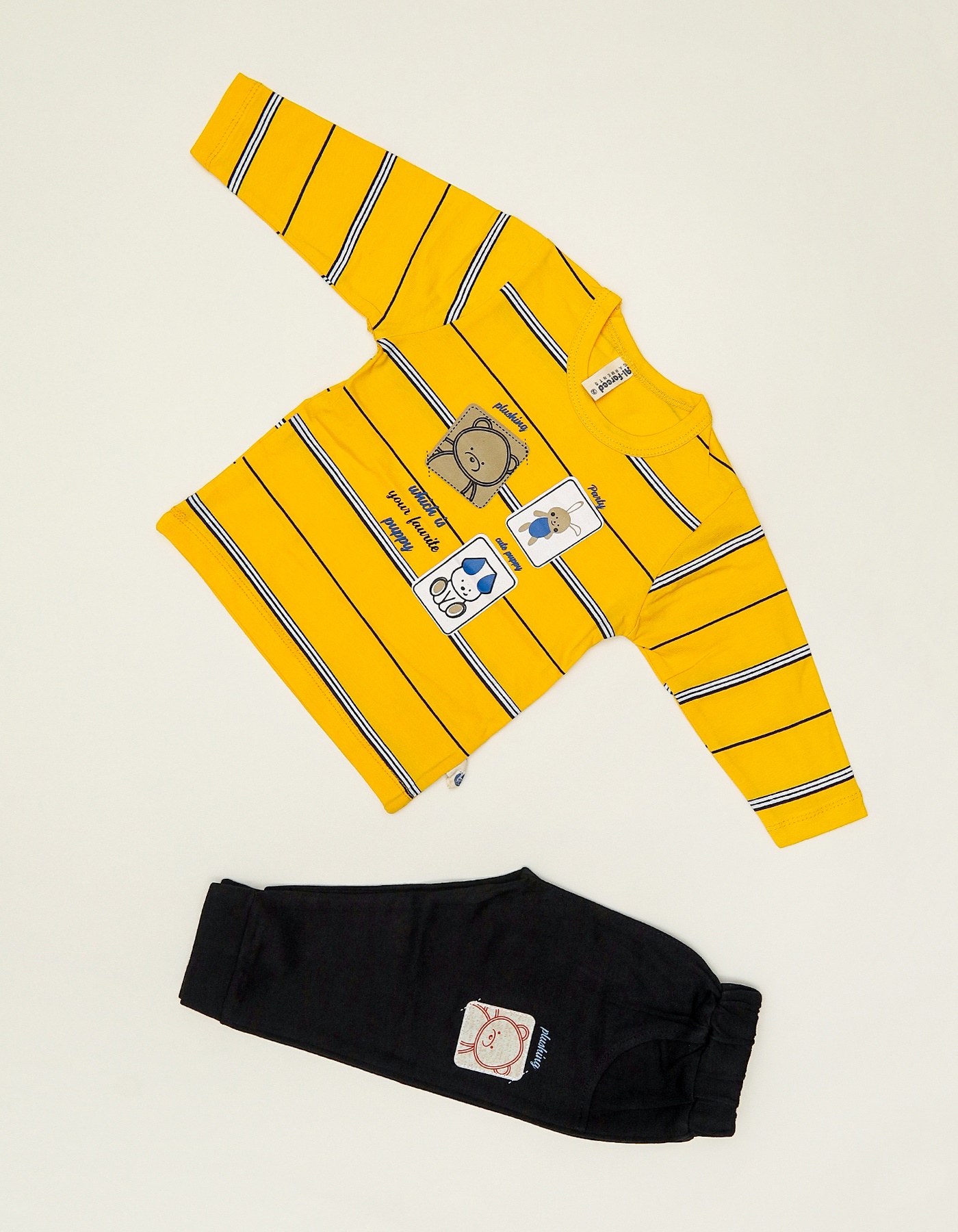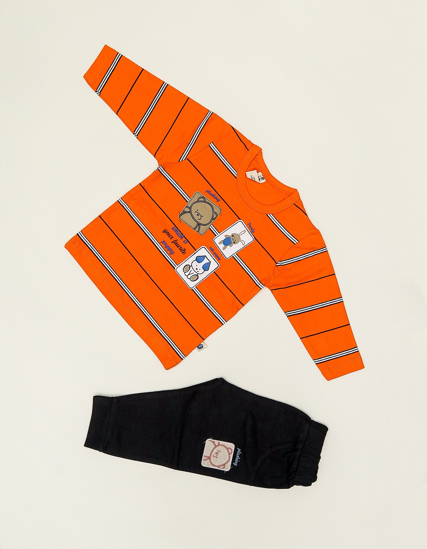 A fun and stylish 2-piece outfit designed for boys. The striped sweatshirt with cute cartoon patches pairs perfectly with comfy jogger pants.