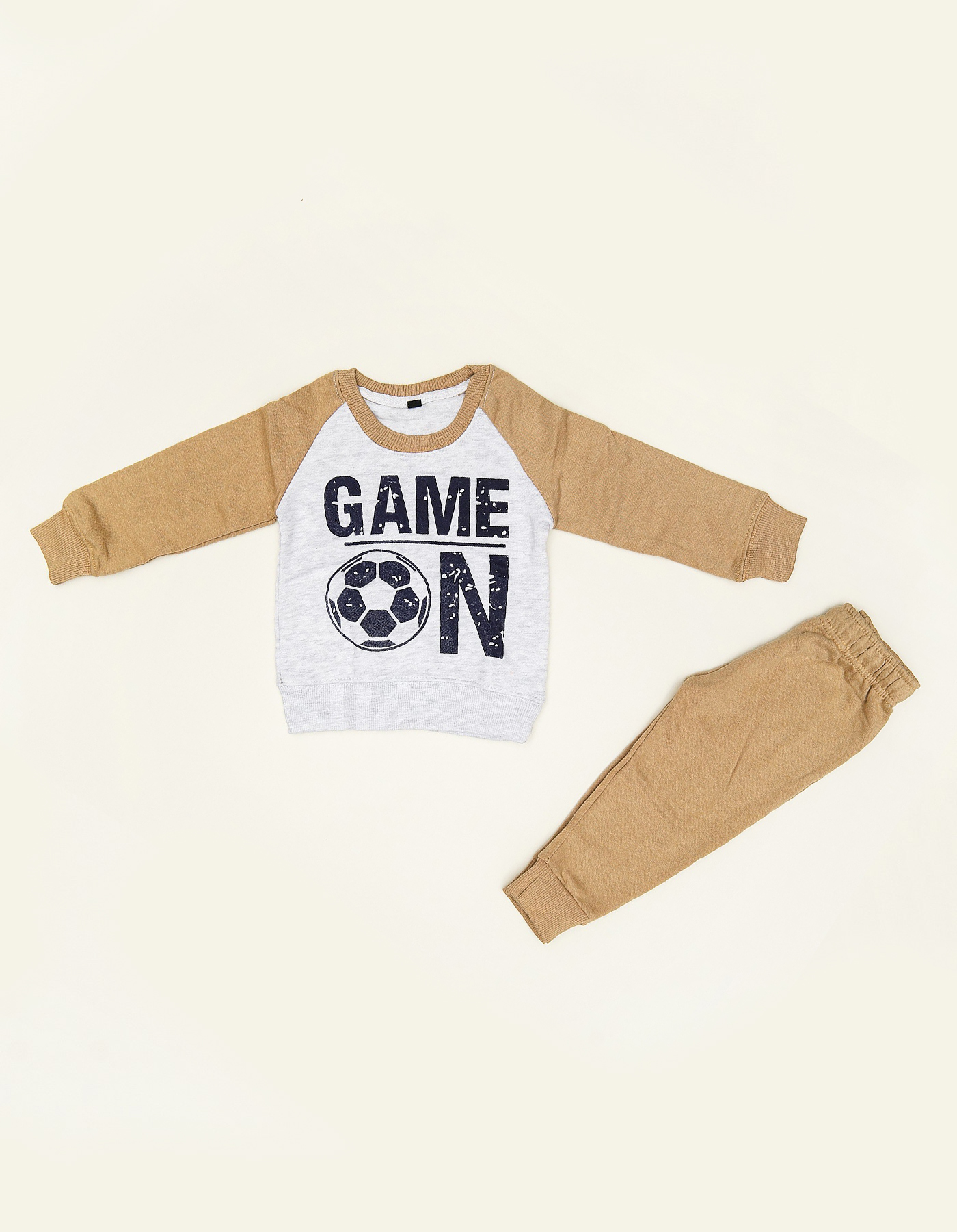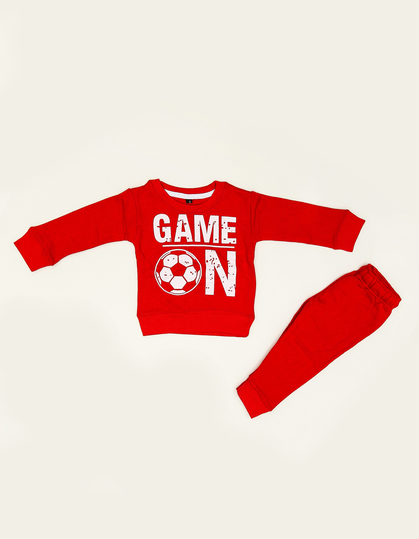 Playful and energetic, this boys tracksuit is designed for young sports fans. Featuring a bold Game On slogan with a football graphic, it is perfect for active kids who love comfort and style.