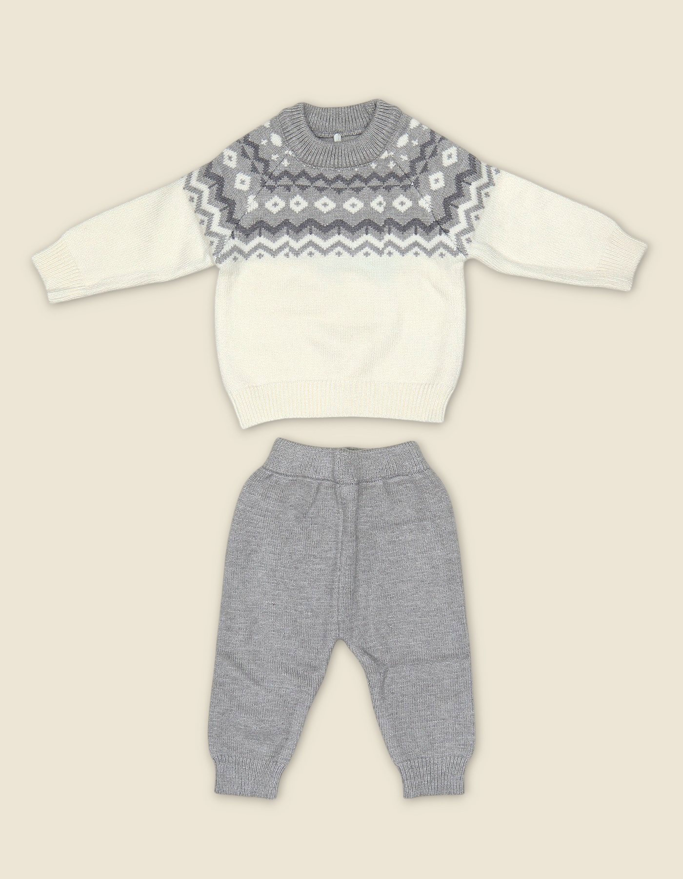 Elegant woolen outfit for boys with geometric pattern sweater and matching pants. Designed for warmth, comfort and refined winter style