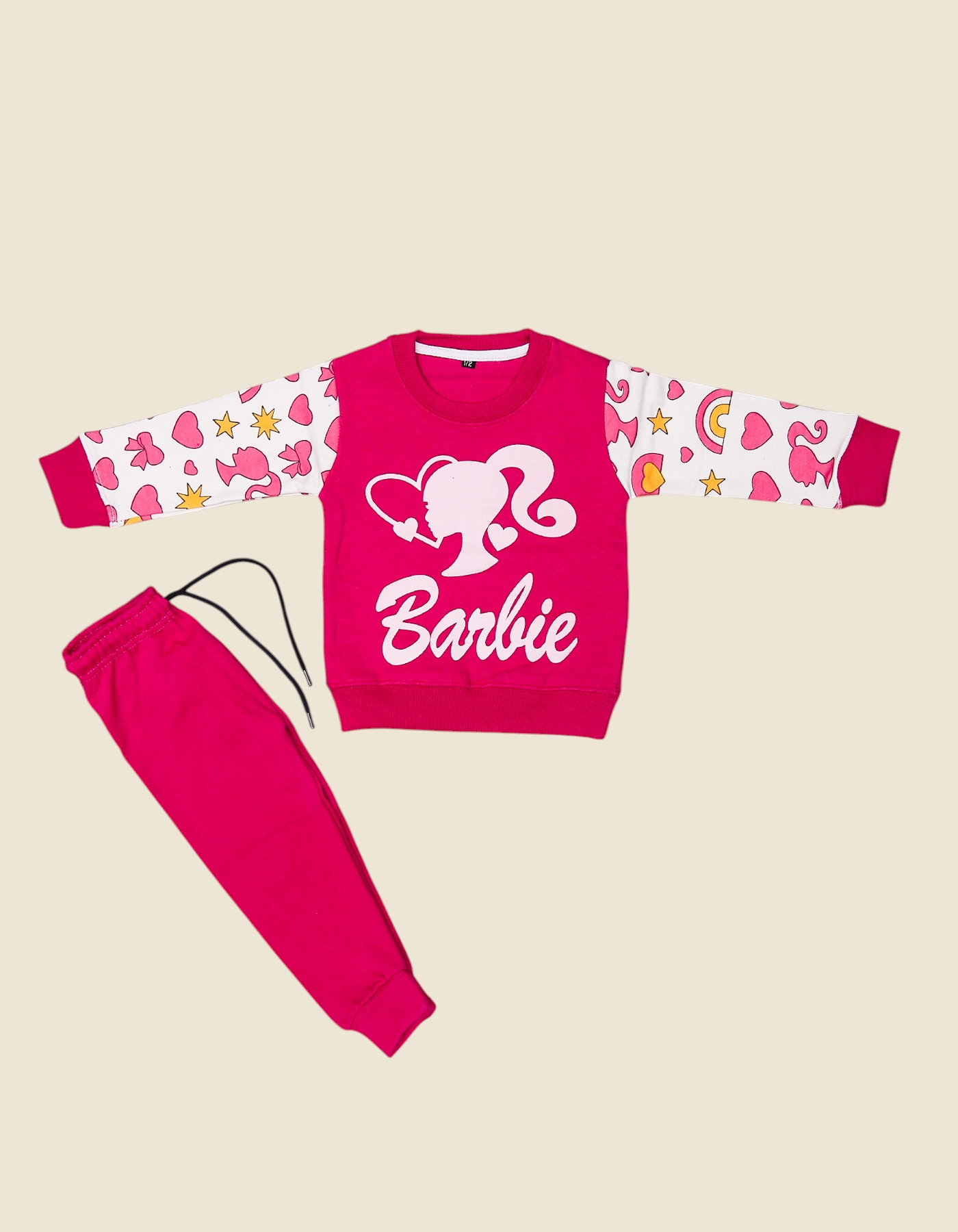 Bring fun, fashion, and comfort together with this Girls Barbie Print Track Suit. The set includes a vibrant pink sweatshirt with Barbie print and patterned sleeves, paired with matching jogger style pants. Made from soft and breathable fabric, it keeps your little girl cozy while ensuring freedom of movement perfect for playtime, outings, or casual wear.