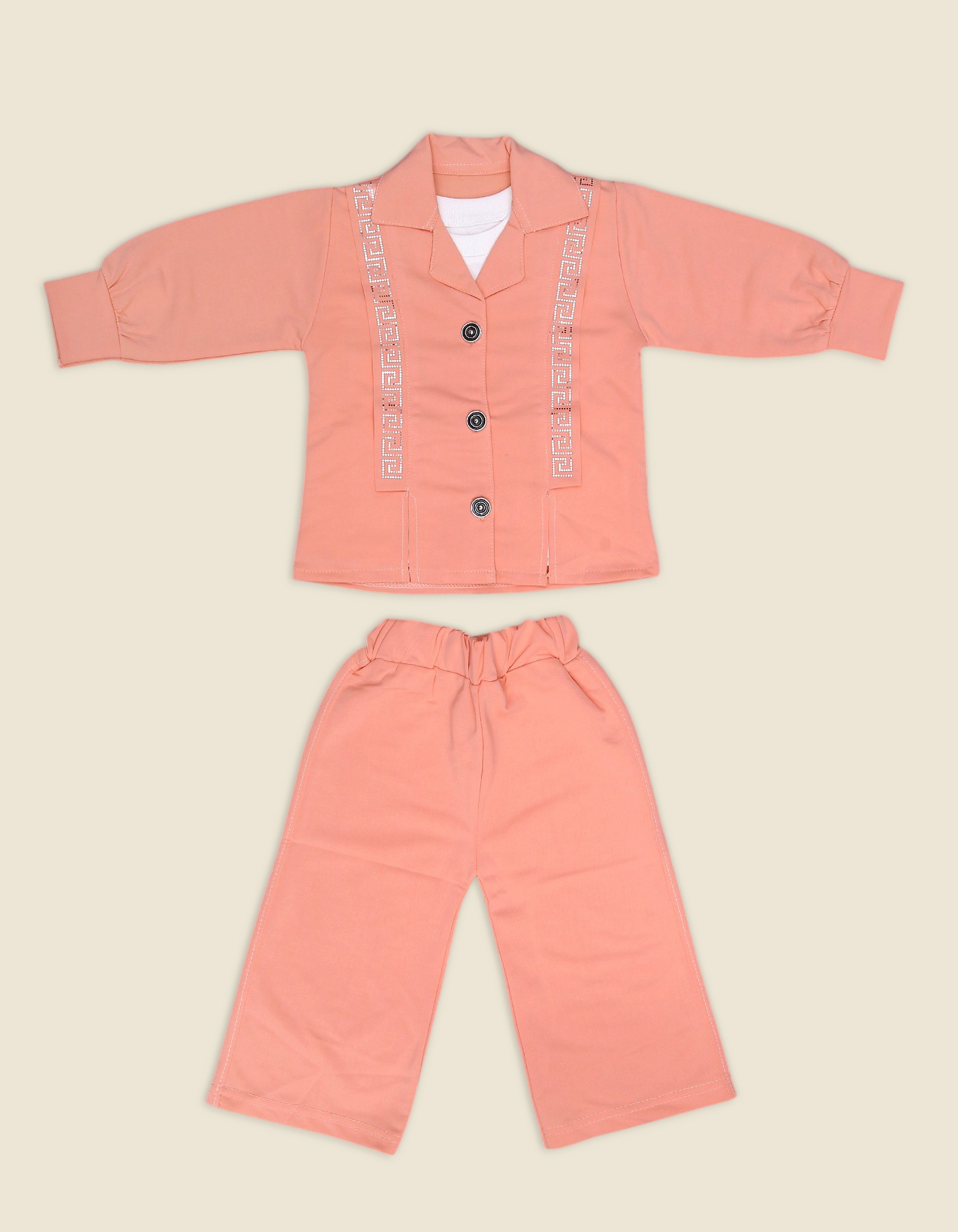 The Girls Classic Formal Suit is a smart and stylish outfit designed for both casual gatherings and semi-formal occasions. This 2-piece set includes a button-down shirt with embroidered panel details and a matching pair of wide-leg pants. Made from soft, breathable fabric, it ensures comfort while giving your little girl a polished look. Available in Peach and Skin shades, this outfit is perfect for events, family gatherings, and outings.