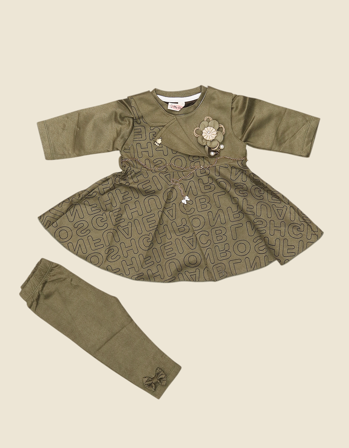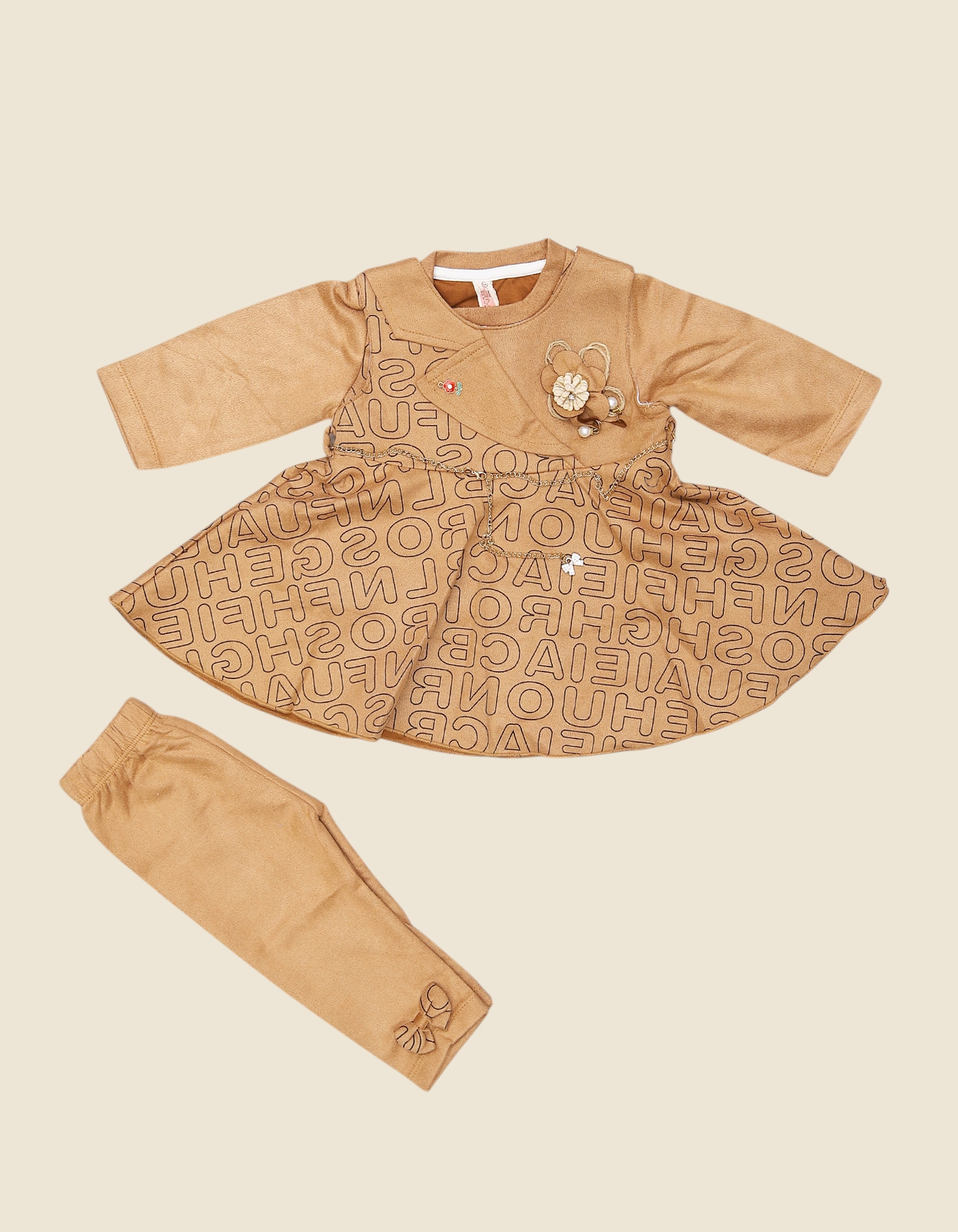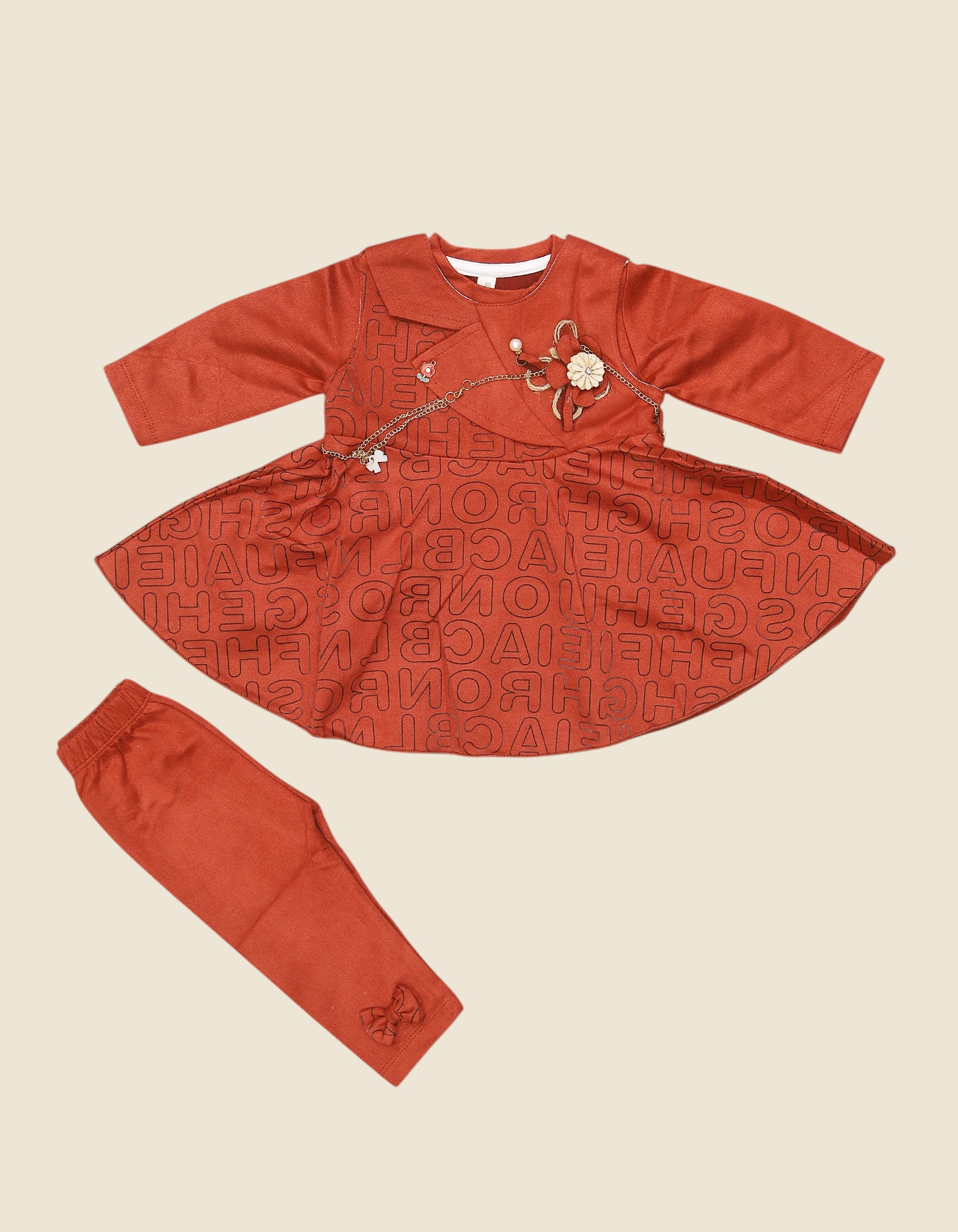 The Girls Floral Charm Frock Suit is a fashionable 2-piece outfit combining a frock-style top with matching leggings. The frock features an elegant floral applique with chain detail and an all-over alphabet print skirt, giving it a trendy yet graceful look. The leggings are designed with a cute bow accent, making the outfit chic and coordinated. Perfect for parties, family gatherings, or casual outings, this set is available in Brown, Green, and Maroon colors, offering both comfort and style for your little one.