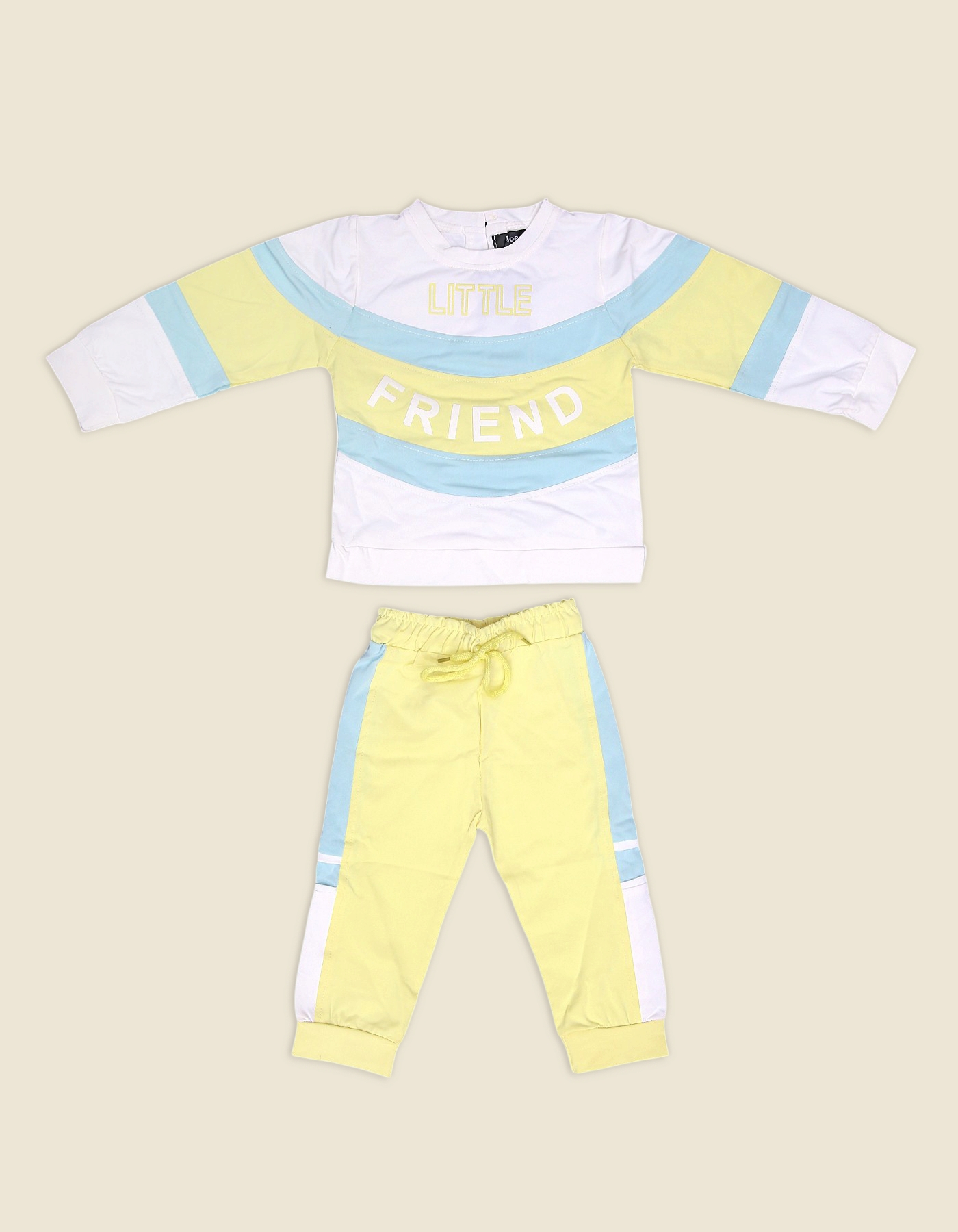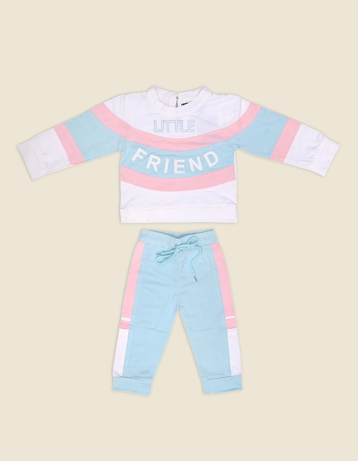 The Girls Little Friend Suit is a bright and playful 2-piece outfit designed for comfort and style. Featuring a trendy color block sweatshirt with Little Friend slogan print and matching jogger pants with drawstring waist, this set is perfect for active little girls who love to look stylish while staying comfy. Available in Baby Pink, Sky Blue, and Yellow, this outfit makes a perfect pick for school, playdates, or casual outings.
