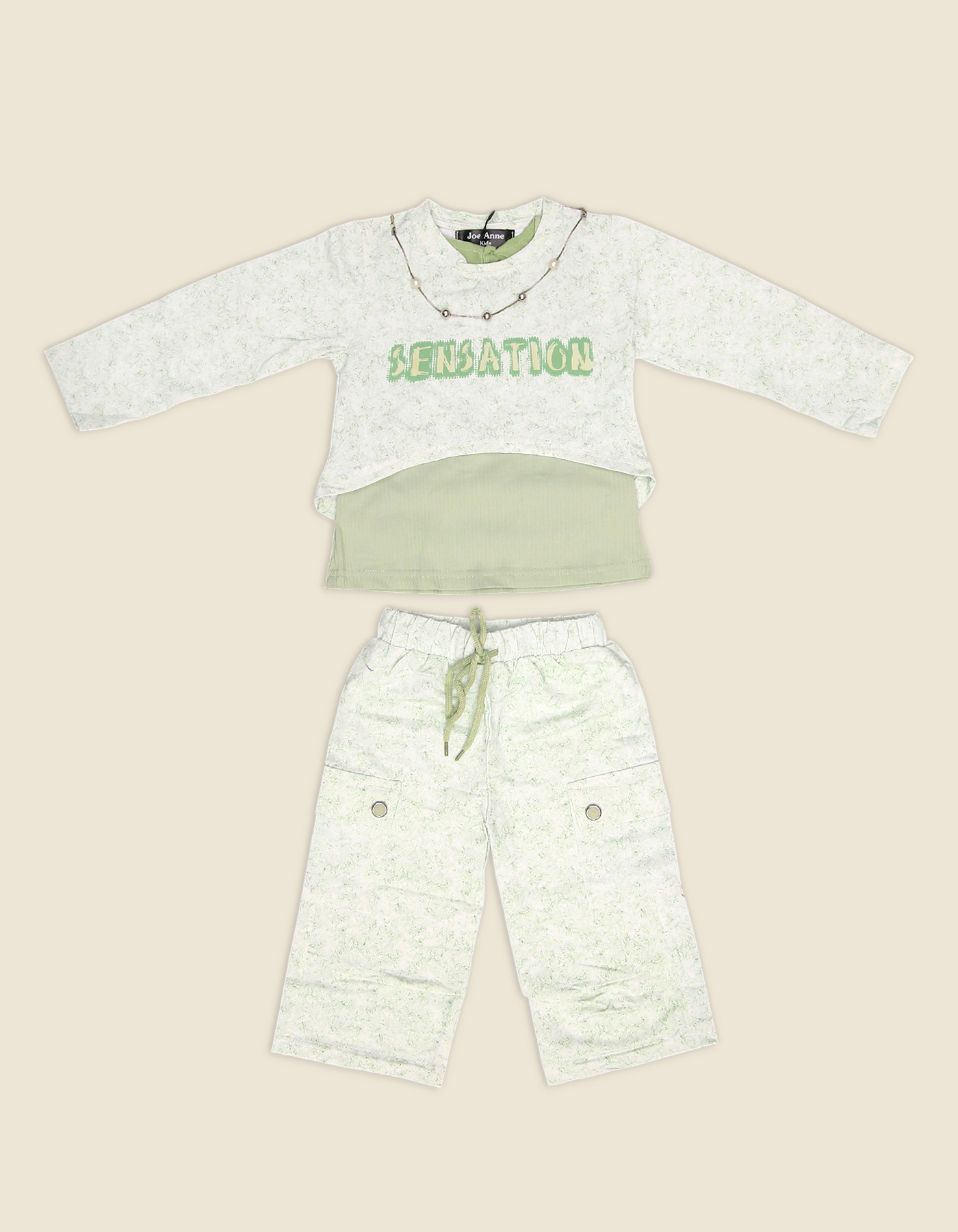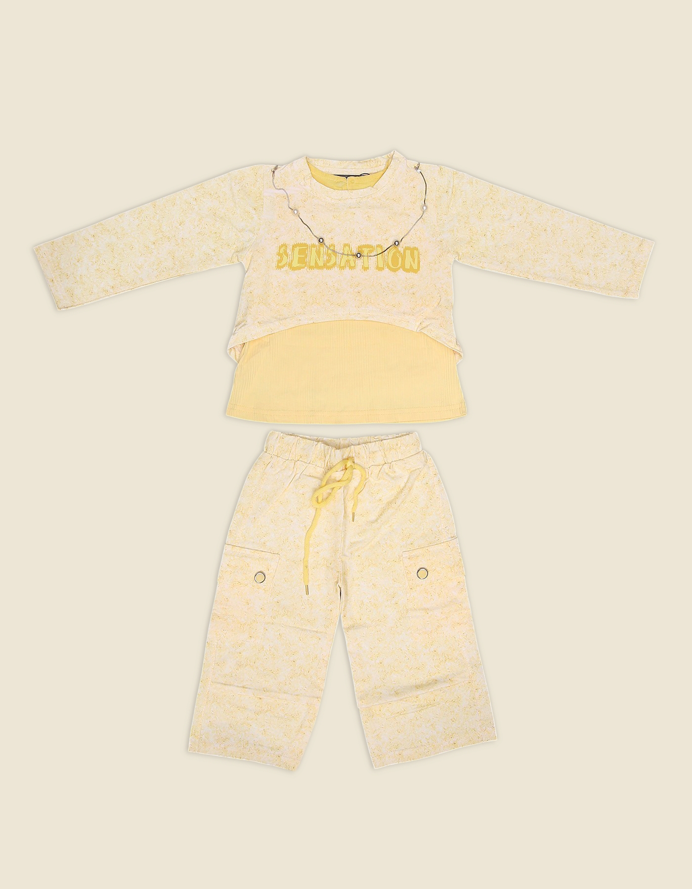 The Girls Sensation Casual Suit is a trendy and comfortable 2-piece outfit designed for an effortlessly stylish look. The set features a long-sleeve layered-effect top with the bold Sensation slogan print and a necklace-style detail around the neckline, paired with cargo-style pants with drawstring waist and flap pockets for a modern touch. Available in Green and Yellow, this outfit is perfect for casual outings, playtime, and everyday wear.