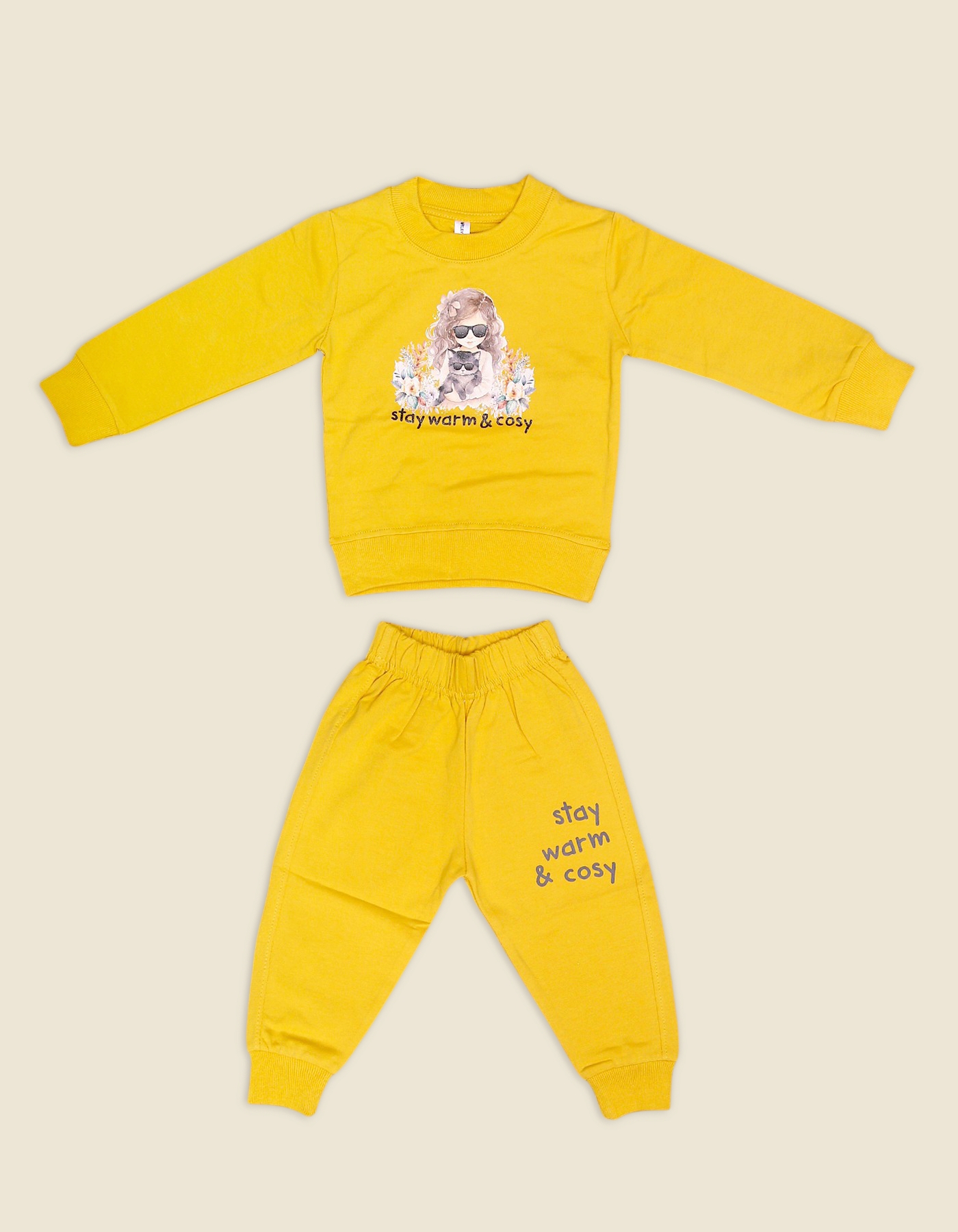 The Girls Stay Warm & Cosy Suit is a charming 2-piece winter outfit designed for both warmth and style. The sweatshirt features a cute girl-with-cat graphic surrounded by floral accents, paired with the motivational text Stay Warm and Cosy. The matching jogger pants also carry the same slogan, creating a coordinated and trendy look. Available in Baby Pink, Red, and Yellow, this outfit is ideal for everyday wear, playdates, or casual outings, keeping little girls stylish, snug, and confident.
